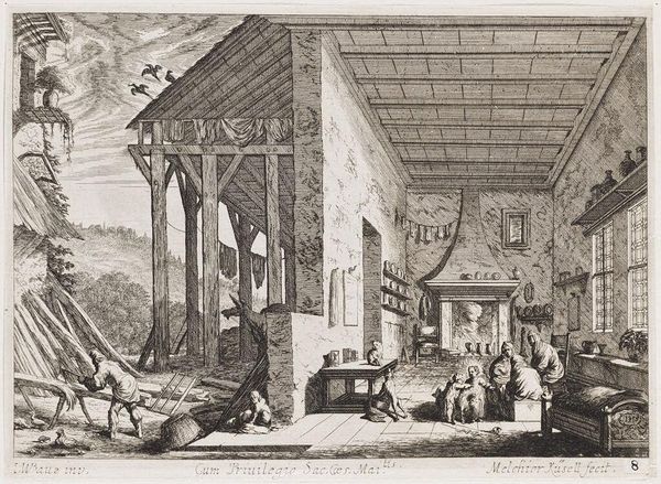 Editor: This etching is entitled "View of a Licorice Factory in Corigliano," by Bernard Antoine Nicollet. The scene is busy. What can you tell me about the purpose of this work? Curator: It's fascinating, isn't it? I see it as a glimpse into the industrialization of food production and its impact on labor. Consider the visual representation of workers and their relationship to the factory's architecture. Is there a celebration of progress here, or perhaps a commentary on the human cost? Editor: That's a good point! It hadn't occurred to me to consider whose viewpoint Nicollet was trying to convey. Curator: Precisely. These images played a role in shaping public perception. Thinking about the intended audience and the social context is critical. Editor: I'll definitely keep that in mind moving forward!