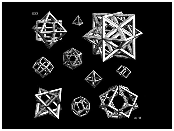 Editor: Here we have M.C. Escher's "Stars" from 1948, a print rendered in graphic art style. I’m struck by its impossible geometry and the two chameleons nestled within. It's…baffling! What can you tell me about this work? Curator: Escher's "Stars" is indeed a captivating enigma. Beyond its immediate visual impact, consider the recurring motif of stellated polyhedra. These aren't just geometric shapes; they're ancient symbols often associated with the cosmos, spirituality, and even Platonic philosophy. Notice how Escher positions the chameleons within the framework. Editor: The chameleons feel deliberately placed. Curator: Precisely! Chameleons, culturally, represent adaptation, change, and sometimes even deception. Escher, fascinated by tessellations and transformations, seems to be using them as a symbolic stand-in for the human mind’s ability to perceive and adapt to shifting realities. The whole work could be a visual metaphor for cognitive flexibility in a complex universe. Does that reading resonate? Editor: It does, actually. So, the geometric figures are about universal truths, and the chameleons are how we grapple with them? Curator: A possibility, yes. Or, consider this: are the stars a cage? Are they a home? Are the chameleons trapped, or are they perfectly content within their geometrical constellation? Escher prompts us to ponder these dualities. Editor: That’s really thought-provoking. I initially just saw a cool optical illusion, but there's so much more layered beneath the surface! Curator: Exactly. The enduring power of images lies in their ability to be reinterpreted across time and cultures.
