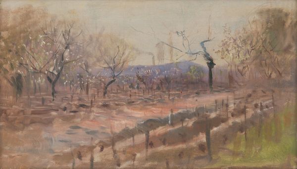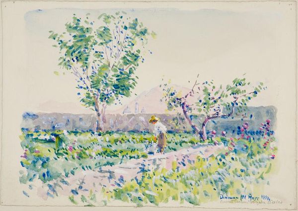 Editor: This watercolor painting, titled "Blooming Tree," was created by Ladislav Mednyánszky sometime in the early 1900s. It feels almost like a sketch, very immediate, with soft washes of color defining the trees and landscape. What do you make of the artist's technique here? Curator: Well, looking at the watercolor and its impressionistic style, I'm drawn to how Mednyánszky engaged with the materiality of the medium itself. Watercolor allowed for quick, plein-air studies, linking artistic production directly to observation and immediate environmental conditions. Consider the socioeconomic implications: who had access to materials like watercolor paints and paper at the turn of the century, and how does that affect our understanding of the subject matter? Editor: That's interesting, I hadn’t thought of it that way. It seems so effortless, but I suppose access to materials wasn't a given. Does the location matter, in terms of what materials were available? Curator: Absolutely. Mednyánszky was a Hungarian artist often working outside of established urban centers, so his artistic choices were shaped by both his geographic location and the limitations that came with that. Furthermore, plein-air painting democratized art production; it wasn't reliant on studio space or patronage. It’s more about his engagement with the physical landscape, less the story it tells than the material reality of its making. How do you perceive the landscape, considering his possible limited means? Editor: So, rather than reading this simply as a pretty scene, we should also think about how the materials and the process itself become part of the painting's meaning, given his place within the art world, both practically and socially. I'll definitely be thinking about that in relation to other artworks too! Curator: Exactly. We are looking at how artistic practices reflected and responded to the material conditions of their production. It gives another depth of meaning to what may seem like a standard Impressionist scene.