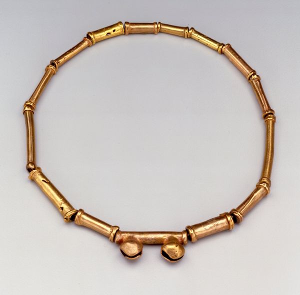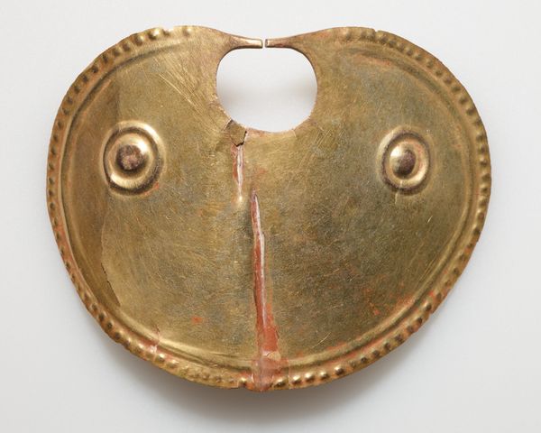 Editor: Here we have a Tairona "Earring" crafted from gold, dating back to the 11th-16th century. It's currently housed in the Minneapolis Institute of Art. The patina is striking! What can you tell me about it? Curator: Focus first on its form. The almost perfect semi-circular shape of the "Earring", or rather, the labret, dominates the piece. Consider how the interior edge curves elegantly, creating a continuous line that emphasizes the circular void within. What is the affect of the rounded geometry, can we compare it to others in the archeological record? Editor: It feels quite heavy but the hollow space communicates both preciousness and austerity. How did the Tairona achieve that shape and is the patina indicative of its age? Curator: Observe the textures, running from the smooth burnished areas to the matte patination. The metallic surface seems to vibrate as these areas recede and protrude from one another. Think, too, of the methods by which the Tairona may have constructed this item - lost wax casting seems likely. Its circularity evokes unity and cyclical continuity central to Tairona cosmological views, as are the effects of age which suggest deep ancestral connections. What do the binary relations, matte/burnished, presence/absence, exterior/interior, suggest to you about our experience with form? Editor: That it can change our perceptions through different focal planes that force the observer to move through space in relation to the artifact. Curator: Indeed! Such works call to question our habitual perception by heightening sensitivity to detail. In looking closely we begin to realize how structure and arrangement of materials shape both perception and meaning. Editor: So true! It's all about the eye and where it falls!