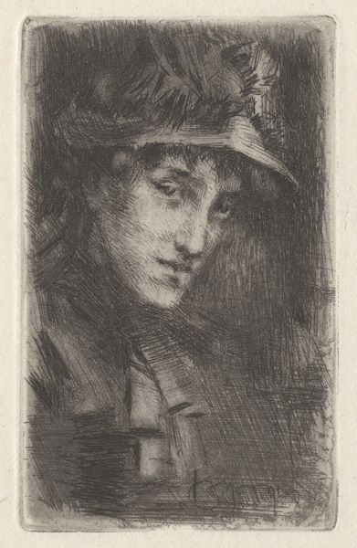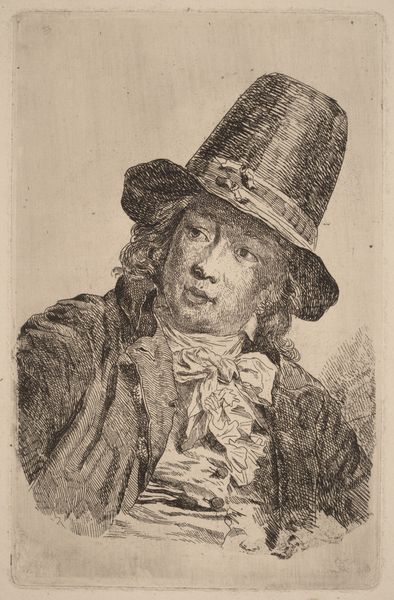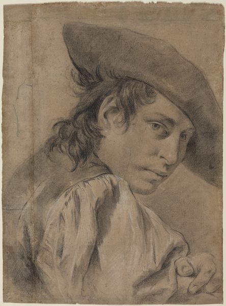 Editor: Here we have a drawing entitled "Junger Mann mit Hut, Brustbild nach rechts," or "Young Man with a Hat, Bust Portrait Facing Right," attributed to Cornelis Visscher, currently residing in the Städel Museum. It seems to be crafted from charcoal and chalk. I find it striking how the artist captures a pensive, almost melancholy mood. What stands out to you most when you look at this piece? Curator: Melancholy is a fascinating starting point! For me, the genius lies in the texture Visscher coaxes from the chalk and charcoal – almost tangible, wouldn't you say? I'm drawn to the way light dances across the planes of his face, hinting at untold stories. It reminds me of those smoky Dutch interiors, doesn’t it? You can almost smell the pipe tobacco and hear the hushed conversations. Does his gaze make you wonder what occupies his thoughts? Editor: It definitely does. I was also struck by the contrast between the detail in his face and the looser rendering of his clothing. Curator: Precisely! That contrast adds to the dynamism. Visscher’s economy of line is breathtaking. Look at how few strokes are needed to convey the brim of that hat! And what does that hat tell us about him, do you think? Is he hiding or trying to make a statement? Editor: Perhaps he is a bit of a rebel! It's certainly a rather jaunty angle. I hadn't considered how much personality could be packed into a simple portrait like this. Curator: Absolutely! And that's the magic, isn't it? A simple image that resonates through centuries and somehow echoes something within ourselves. Each viewing is like meeting him for the first time, armed with new perspectives. What do we really know about him now that we didn't when we started? Editor: I feel I've gained a deeper understanding of the subtleties of portraiture and how an artist can convey so much with seemingly simple techniques. It’s like a tiny window into another time.