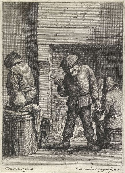 This print, titled "Avond," was made by Frans van den Wijngaerde. Its composition is dominated by the interior scene featuring three figures around a fireplace, rendered with fine, detailed lines. The figures, illuminated against the dark background, create a stark contrast that draws our eyes to the center. Van den Wijngaerde employs the etching technique to explore themes of leisure and everyday life. The use of light and shadow is particularly striking, emphasizing the rough textures of the clothing and the weathered surfaces of the interior. We can see the diagonal lines of the wood panels that converge at the top right and the stool at the center. The detailed cross-hatching not only defines forms but also conveys a sense of depth. The interplay of light and shadow serves to subtly destabilize traditional notions of space, suggesting an almost dreamlike atmosphere. Ultimately, the brilliance of "Avond" lies in its ability to use simple visual elements to construct a complex narrative, inviting viewers to contemplate the cultural and philosophical implications of the seemingly mundane.