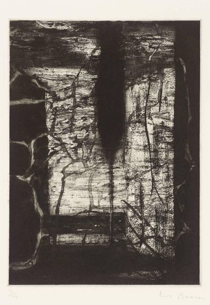 Curator: I see an image composed of vertical and horizontal lines—the texture looks almost coarse. Editor: This is an untitled print by César, the French sculptor known for his compressions. We find it at the Tate. Curator: The lattice effect is intriguing. Is it about confinement or structure? The scratches disrupt what would be a rigid grid. I can't help but think about how these forms are related to power. Editor: Right, César's work often challenged traditional notions of sculpture and the art market itself. What do you make of its impact? Curator: It feels immediate but also invites a slower reading. The contrast between the planned grid and the chaotic scratches makes one ask questions. It's a piece that gains from multiple viewings. Editor: It certainly opens up avenues of interpretation, highlighting the artist's complex engagement with modernity.
