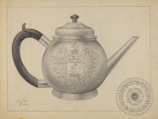 Curator: Before us is "Silver Teapot," a drawing executed between 1935 and 1942 by Vincent Carano, rendered with pencil and coloured pencil. Editor: The metallic sheen is striking, especially achieved with such humble materials. I’m curious about the labour required to depict this with such exactitude and nuance, but I wonder what use it served to draw a shiny teapot in the first place? Curator: Well, looking at it, the decorative flourishes tell a story of cultural tradition and perhaps social aspirations. Think of the act of sharing tea as ritual—laden with meaning, from colonialism and trade, to gendered social gatherings. It’s not JUST a teapot. Editor: Agreed. Though I am compelled by the actual process of its making. Imagine Carano carefully layering those pencil strokes, attempting to simulate the material properties of silver! It highlights how we assign value, culturally and economically. Silver, tea...commodities tied to labor. Curator: And consider, who was this for? Was it a study, a design, or an exercise? The almost photorealistic depiction, combined with the detailed heraldic symbols, begs questions about status, ownership, and inherited power. Editor: These details give insights to the status of things. It seems likely to me that the drawing and the object relate intimately to the systems that allowed both their making and design. A celebration of craft and commodities. Curator: It’s interesting how we interpret 'craft.' For so long, items made for domestic use were undervalued in fine art discourse. Placing this piece now allows a platform to examine how objects reflect identities. This silver teapot evokes notions of elegance, femininity, tradition and also privilege. Editor: So, from the means of production to the symbolism inherent in this drawing, this work encapsulates so many connections—social status, the economics of luxury. And what now is its use after existing between these gaps in its making and our current views of what objects tell us about the time they exist in? Curator: I see this humble teapot as a looking glass reflecting not just a beautiful object but revealing aspects of society and historical discourse. Editor: Precisely! And it reminds us to look beyond the surface to uncover the layers of social, material, and personal meaning embedded within the mundane.