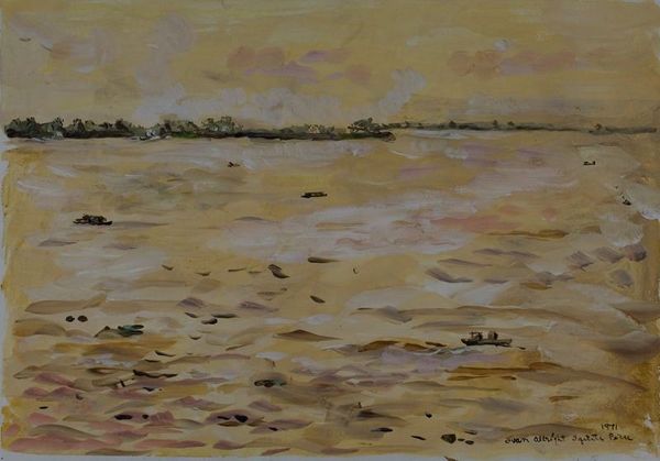Editor: We're looking at "Seaside at Arad Fort" by Rashid Al Khalifa, created in 1987. It's a vibrant painting that captures a seascape. I find the brushstrokes create a shimmering effect, especially on the water. What strikes you about the composition and technique in this piece? Curator: The interplay of colour here is intriguing, isn’t it? Notice how Al Khalifa juxtaposes the cool blues and greens of the water and sky with the warmer yellows and browns of the shore. The visible brushstrokes contribute significantly to the texture and depth; consider how they guide the eye and construct the form, almost independently of any mimetic function. Is the perspective linear, atmospheric, or something else entirely? Editor: I see what you mean about the colours. It almost vibrates! It feels very evocative. It makes me wonder about the point of view. It's not exactly like I'm standing there, but it feels like a real place. It's not hyperrealistic but... the colours evoke light so vividly! Curator: Exactly! Focus on how colour relations work, the flatness of some areas, the textures and juxtaposition that do create spatial illusion... Also, how do you interpret the presence of the small boat? Is it an essential component of the composition, or perhaps symbolic within the landscape? Editor: Hmm, I hadn't considered the boat as symbolic. Perhaps it's there to give a sense of scale, emphasizing the vastness of the seascape. Also the human element adds something more specific in terms of subject than say just a bare beach with sky and sea. Curator: Precisely! We might observe how it anchors the composition and adds depth of human activity amid the broader scheme. Now that you point out about subject - a question for you, and other considerations of form: Could Al Khalifa be making commentary or expressing an experience? Editor: Well, this makes me appreciate how every aspect of an artwork, from the colour palette to composition contributes meaning beyond just the immediate image. It feels so much richer to understand. Curator: Indeed. Attending to the formal properties enriches our encounter with the work of art. I, too, discovered an extra dimension, revisiting what's truly there within "Seaside at Arad Fort".