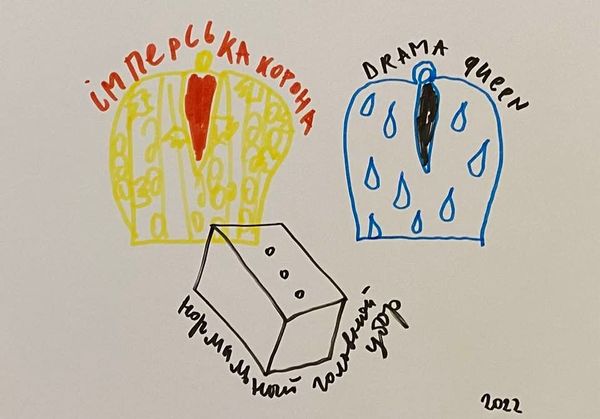 Alevtyna Kakhidze made this untitled drawing using what looks like felt tip pens or coloured pencils. There's a raw simplicity to the marks, like a child's drawing, but it speaks volumes. The surface is just plain paper. You can almost feel its texture. The colours are direct, primary. A yellow crown hovers, dripping melancholy, while another stands firm, flanked by what looks like Russian flags. The red scribbles beneath it could be flames or blood. It's all so direct and unpretentious, but that's what gives it its punch. Look closely at the wobbly line that makes up the horizon, it's so vulnerable and yet so assertive. It reminds me a bit of Philip Guston's later work, that same embrace of the naive and the deeply felt, as though truth can only be told through such plainness. In the end, it's the honesty that grabs you. It doesn’t try to be slick or clever, just raw and real.
