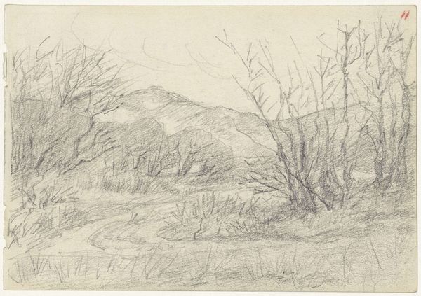 Curator: This is Dirck Nab’s "Duinlandschap," rendered in ink on paper in 2007. A quick sketch, yet evocative. Editor: My first thought is… winter. It's a spare, desolate scene. The monochromatic palette adds to the feeling of starkness, of something dormant, waiting. Curator: Absolutely. Let's examine how Nab employs line to construct this mood. Note the stark, wiry quality defining the vegetation in the foreground, the way the lines refuse to resolve into anything traditionally picturesque. Editor: Indeed. Observe how the line becomes almost gestural, communicating the rawness of the landscape. In older iconography, barren trees can symbolize not only winter but also themes of mortality, transition…even spiritual testing. Here, I see it less as somber but more the natural world, persevering and being itself. Curator: The structural composition of the image draws the eye upward and into the hazy distance. The lack of dramatic contrast, or strong tonal modeling, almost flattens the planes of the landscape which gives it a sort of modern spin to this traditional theme. Editor: Agreed, there’s a quiet simplicity, like looking into the artist’s mental state or emotional condition while making it. Curator: The unadorned quality almost resists romantic notions, pushing the viewer to focus instead on pure structure. It’s an intriguing work, as much for what it leaves out as what it includes. Editor: A minimalist testament to the enduring power of natural symbols. It demonstrates how a scene so stark can evoke profound questions about our place within the cyclical rhythms of the world. A humble meditation.