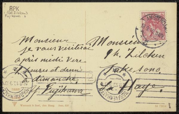 Curator: This is "Briefkaart aan Philip Zilcken" by Alphonse Stengelin. Its creation is estimated between 1920 and 1925. It combines poster elements with mixed media. I’m particularly drawn to how it captures a moment in time. Editor: My first impression is the chaotic elegance. The penned cursive fights for space with the printed elements; a beautiful jumble. It seems incredibly intimate, a whispered secret from one friend to another, despite its poster format. Curator: Absolutely, the tension between the printed postcard format and Stengelin's spontaneous script gives the piece so much character. Note how the printed text creates the bureaucratic and formal stage for interpersonal dialogue. I think the calligraphy's hasty marks contribute to its feeling of intimacy, like eavesdropping on an inside joke. Editor: The layers speak to the democratization of communication that was burgeoning in the early 20th century, wouldn’t you agree? This little piece represents a kind of modern moment, a postcard which exists now in both the sender and receiver realms. I notice an implied class dynamic, as well. Do you have some insight into Stengelin and Zilcken themselves? Curator: Well, at that time, the rise of mass communication redefined how people shared their experiences. The poster aspect makes me think of the burgeoning consumer culture, while the personal message retains traditional intimacy. This blend really does sum up the social landscape of that era. Sadly, the particulars of their social class or personal dynamics escape me. I agree, the dialogue is quite tantalizing in its historical context. The postmark reads Geneva, April 6th, 1920. Imagine the historical backdrop and everyday dramas that marked their exchange! Editor: Agreed. I think what resonates most is the human touch amid all the mechanical reproduction; the quickly scribbled sentiment is all that we need. It captures the fleeting feeling and intimacy often missing in official modes of exchange, in general. It reminds us of history's intimate human scale. Curator: Beautifully said. The intersection of public communication and individual expression – Stengelin captured it with this brief but compelling card. It's like a micro-historical event rendered visible. Editor: I concur; this layered little message has quite the lasting resonance. It reminds us to value the quiet echoes in history’s grand halls.