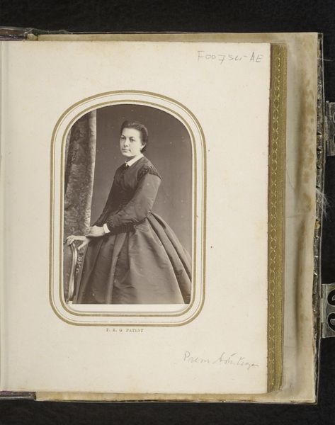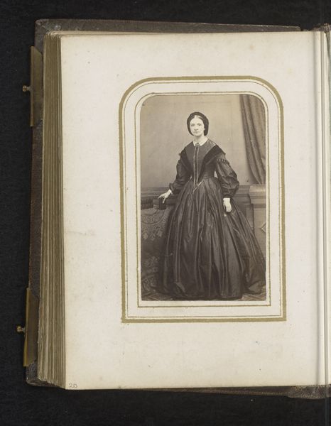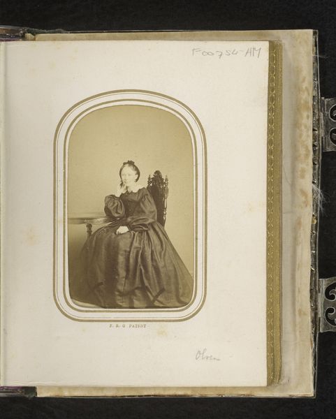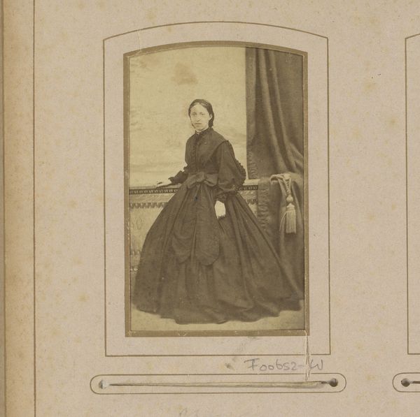 Curator: Looking at this albumen silver print, one immediately notes a somewhat somber atmosphere. The subject, a woman elegantly posed, is captured with a certain gravity. Editor: And presented as “Portret van een vrouw met waaier” – Portrait of a Woman with a Fan. Produced sometime between 1860 and 1880, by V. Vagneur, this piece intrigues me particularly regarding its photographic process, this specific approach in photography production as an industrial activity that became more popular around that time. Curator: The context is definitely crucial. Studio portraiture in the mid-19th century had democratizing effects. While traditionally, portraiture was a domain for the elite and powerful, photographic technologies, gelatin-silver-prints to be precise, made this attainable for the emerging middle class. This allowed people to create and curate their own representation, fashioning identity through posing and presentation. Editor: Exactly. I mean, let's consider what a photograph meant then – an extraordinary object of labor, where light-sensitive materials become image carriers through a complex series of manipulations, fixations, and washes. The photograph here isn't simply an image. It is a social commodity and artifact loaded with meaning through each individual step in its physical development. Curator: I concur. She embodies this emergent power through her attire. What some could define as a modest gown carries weight in its fabric and length. It silently states class, and, through its careful draping, communicates respectability – ideas essential to her perceived role in society. Her subdued countenance further serves to cement this reading. It becomes less a capture of fleeting emotion and more about preserving and displaying an aspirational status. Editor: I find it fascinating how such a small detail—like a prop fan that, admittedly, is barely present—could signal leisure or refinement, adding a layer of consumption and status. It really tells us how commodities themselves were shaping identity in an emerging consumer culture. Curator: It makes you wonder about the individual's aspirations for social mobility and whether photography provided new opportunities for representing this class’ sense of self in the latter half of the nineteenth century. Editor: Precisely. And considering that, through meticulous analysis of the production involved, these seemingly modest images open avenues to discuss larger themes of labor, production, identity construction, and the commodification of images in the nineteenth century. Curator: Looking at the artwork as a whole really showcases how an artifact—created through specific technical processes—can speak volumes on so many layers within its historical context. Editor: Absolutely, the combination of historical awareness and an understanding of materiality invites viewers to question not only what is depicted, but how it became an enduring visual emblem in social history.