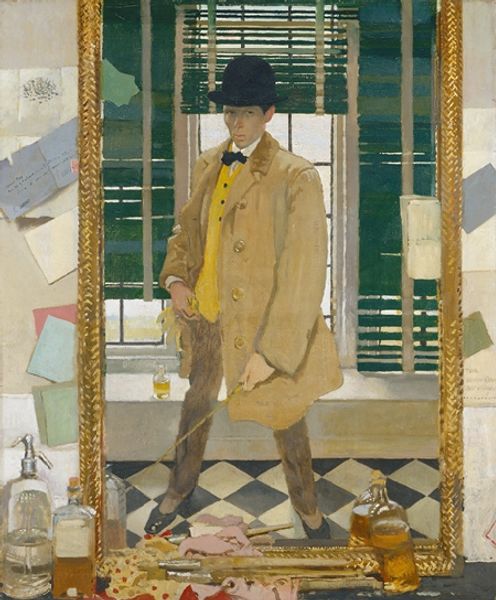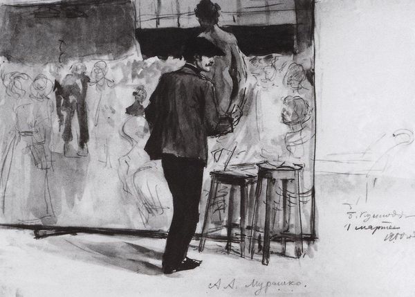 Curator: This is Carl Larsson's "Self-Portrait," created in 1895. Editor: It feels incredibly intimate, doesn’t it? More of a peek into his working life than a formal portrait. There's a charmingly cluttered atmosphere to the studio, the paintings displayed all around. Curator: Precisely! Larsson cultivated this persona of the modern artist deeply embedded in his domestic sphere, and it really cemented his appeal to the rising middle class. This work reflects the public's growing fascination with the artist as a personality, beyond just the producer of artworks. The art world was transitioning to valorize artists themselves, not just their artworks. Editor: Looking at the visible brushstrokes and the watercolor medium, I wonder about the labor involved. Watercolor requires speed and precision, very unforgiving materials. It makes me consider Larsson's everyday life in the studio. Was this piece a preparatory study? Or a sketch executed purely for his own pleasure? Curator: Good question! He embraced watercolor and its associated accessibility to further cultivate his image as a relatable figure. Prints of his watercolors were widely available, and these would have adorned many middle-class homes. Larsson's success was based, in part, on strategically positioning himself and his artwork for reproduction and distribution. Editor: The easels laden with works-in-progress fascinate me. The viewer becomes almost a co-conspirator within Larsson's artistic processes. I wonder what these sketches would sell for, the very texture speaks to his artistic vision. Curator: That's very astute, his marketability extended far beyond paintings. Larsson carefully crafted an entire lifestyle brand, anticipating the blurring lines between "high" art and domesticity. His legacy exists through the market penetration of images of his home. Editor: I’m especially drawn to how Larsson depicts his clothing, how those lines indicate not only his social status, but that this status itself comes from his hard labor in this space, his material processes, it seems… performative. He carefully considered both his craft and public image. Curator: Exactly. Larsson’s ‘self-portrait’ cleverly captures the zeitgeist of the late 19th century. A cultural phenomenon of personality branding that persists even today. Editor: The painting encourages viewers to connect with an artist whose self-image played a powerful role in establishing a vision that lingers over a century later.