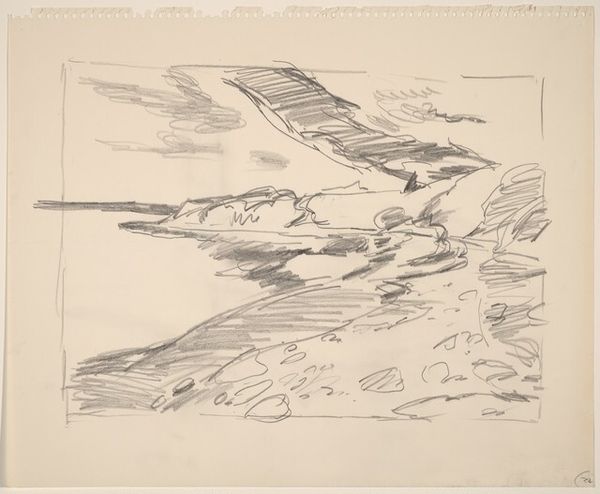 Editor: This is Anton Mauve's "Wandelaar in een landschap," created sometime between 1848 and 1888. It's a pencil and pen sketch currently housed in the Rijksmuseum. I’m immediately drawn to the stark simplicity of the lines, almost skeletal in their form. What elements of composition stand out to you in this piece? Curator: The composition is intriguing precisely because of its seemingly unfinished quality. Consider the distribution of tonal values: the concentrated darkness of the figure is offset by the atmospheric rendering of the landscape. Note how the horizontality of the land is created by the energetic strokes in the foreground against a softer graduation of tones in the background. Do you see a dynamic relationship emerging between these formal elements? Editor: Yes, I notice how the density of the figure almost grounds the entire composition, preventing it from dissolving entirely into abstraction. The stark contrast keeps the eye moving. Is there significance in what is not drawn here? Curator: Indeed. The negative space surrounding the figure is just as crucial. It emphasizes the figure’s isolation. The lines, even when seemingly random, adhere to principles of pictorial structure. Look closely, how does the artist imply space, depth or movement with minimal marks? Editor: The way the lines fade suggests distance, especially in the "sky". And the denser strokes on the ground hint at movement of air or maybe just add texture, bringing the foreground forward. I wouldn't have noticed it if you hadn't prompted me. Curator: Precisely! These formal considerations allow us insight to the work that goes beyond just mere representation. Focusing on such fundamental elements lets us appreciate how seemingly simple means create complex relationships within the pictorial space. Editor: It makes you appreciate how much detail can be suggested with so little. Thanks!