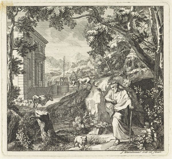 Johann Sadeler I created this engraving of Saint Theobald as a Hermit. Observe the small cross atop both the stone structure on the left and the thatched-roof shrine on the right; they are central to understanding the work's message. The cross, universally a symbol of Christian faith, here signifies Theobald’s devotion and spiritual retreat. This motif echoes across centuries, appearing in diverse forms from ancient Roman crucifixes to modern minimalist designs, each bearing witness to enduring belief. Think about the psychological weight of this symbol. The cross serves as a focal point for reflection on suffering, sacrifice, and redemption, engaging viewers viscerally and prompting introspection. Theobald in prayer mirrors countless artistic depictions of supplication, from antiquity to contemporary art. These recurring gestures, like echoes in a vast hall, unite humanity across time through shared expressions of hope, repentance, and reverence. The symbol of the cross and the gesture of prayer are not static; they are living entities, continually reshaped by cultural forces and individual experiences. Their persistence reveals a profound connection between past and present, reminding us that history is not linear but cyclical.