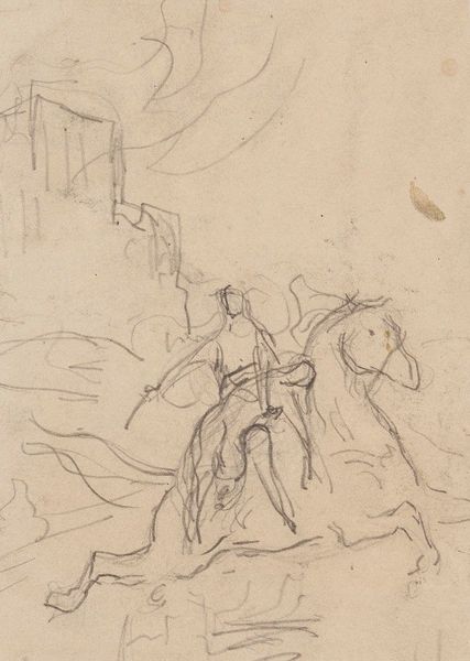 Curator: This sketch by Joakim Skovgaard, made with pencil on paper around 1895-1896, is called "Opstandelsen," meaning "Resurrection." It resides at the Statens Museum for Kunst. Editor: It has such a light, airy feel despite the gravitas of the subject! It's almost dreamlike with these faint outlines of figures. Curator: Indeed, the pencil strokes almost evaporate on the page. Skovgaard was deeply embedded in the cultural moment of national romanticism and sought to use biblical narratives to express something universal about the Danish soul. Editor: Well, resurrection, across cultures, represents rebirth, renewal… Is it fair to say the figure in the middle with that distinctive halo, coming out of some enclosure, depicts Jesus? And an angel, too? Curator: Precisely. Iconographically, we see classic symbolism – the halo as divine light and the angel gesturing perhaps as a witness or herald of this momentous occasion. The very faintness gives it, dare I say, a kind of democratic appeal in a time of monarchy. Editor: I see the historical reading! To me, this speaks about personal hope. This wispy Jesus ascending hints at the Christian belief that transcends a moment in history and exists in our cultural psyche even today. The figures seem almost archetypal. Curator: Perhaps Skovgaard intended to subtly imbue national identity through religious narrative, which became politically resonant and helped build support during times of war in Denmark’s modern history. The placement in the national museum amplifies this effect even today. Editor: Fascinating how the ethereal rendering underscores not only the spiritual event but its lasting symbolic impact. It also softens, ever so gently, the harder religious narrative we're so familiar with. Curator: This piece then serves as an artifact but, furthermore, shows us that the church became so closely intertwined with the state through its ability to rally national morale during great social and political turmoil. Editor: Beautiful. From personal to political, Skovgaard really gives the cultural imagination free rein.