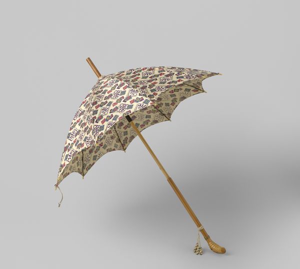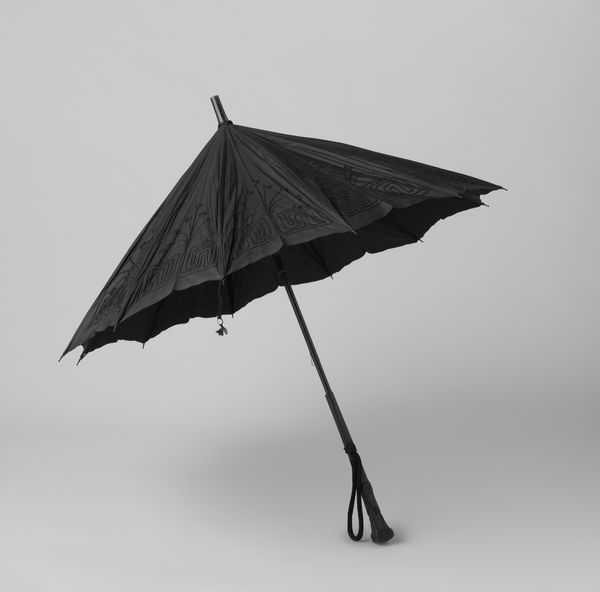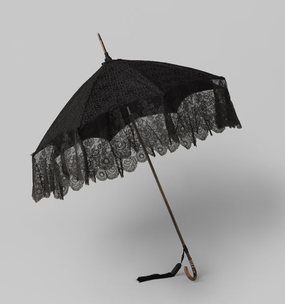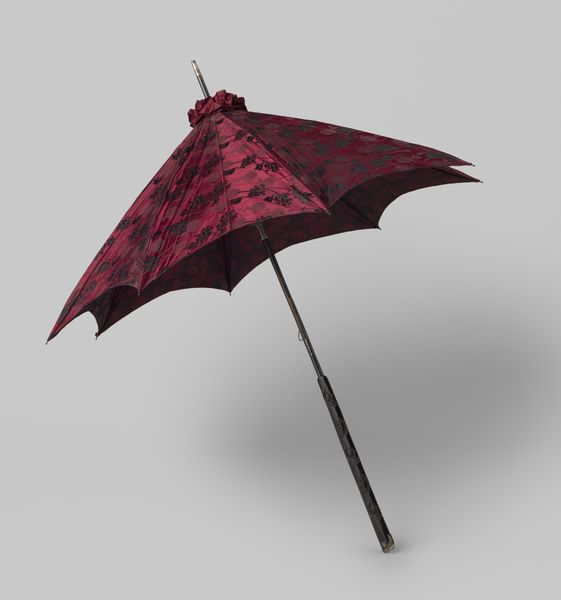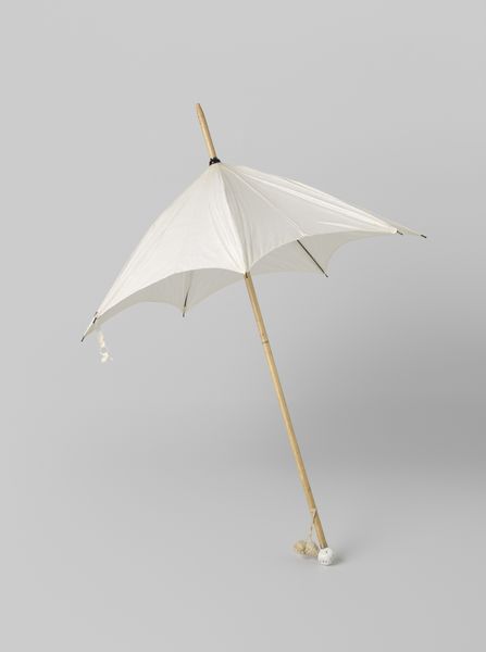 This parasol features a canopy of green silk, adorned with woven stripes along its edge, and is mounted on an iron rod with a wooden handle. Silk, of course, has long been a luxury material. The subtle texture and sheen of the fabric lends the parasol a refined elegance, further enhanced by the delicate stripes woven into the border. Creating a textile like this involved the skilled labor of silk production and weaving. Even the iron and wood components required specialized craftspeople. Consider the social context of this object. Parasols were not just functional items but also symbols of status, shielding the privileged from the sun while also showcasing their wealth and taste. The presence of such an object in a museum collection allows us to consider the intricate relationship between materials, labor, and social status. Looking at the parasol, we can appreciate how the convergence of materials, making, and social context enriches our understanding.
