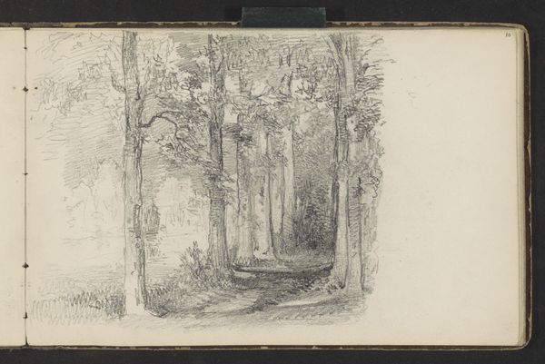Maria Vos created this drawing, "Bomen met laaghangende takken," using graphite, and it now resides in the Rijksmuseum's collection. The initial impression is one of ordered chaos: an exploration of depth, rendered through layered, seemingly disordered marks that coalesce into a coherent grove of trees. Vos uses line and shading to guide the eye into the composition. Dark, emphatic lines define the trunks of the trees on the left, which creates a sense of volume and anchors our gaze. This careful rendering gives way to a freer, more gestural treatment towards the middle- and background, where the lines become softer and more suggestive. The drawing destabilizes traditional notions of landscape art. Rather than a picturesque scene, Vos offers a structural study, where the semiotic elements of line and tone are used to create a spatial illusion. The lack of defined forms and neatness invites us to question our perception and to engage actively with the process of meaning-making. Ultimately, the power of this drawing resides in its formal arrangement, reflecting an evolving dialogue between nature and representation, chaos and order.