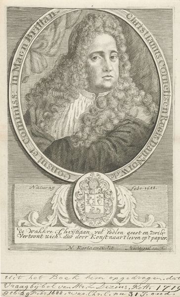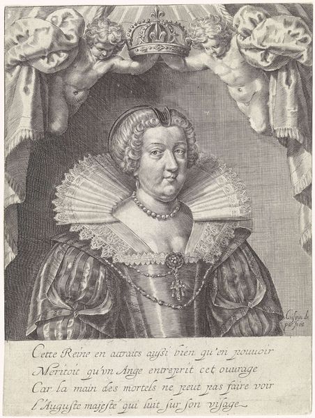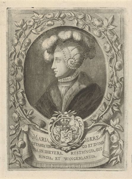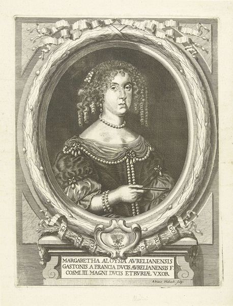Editor: This is an engraving of Amalia van Solms, dating sometime between 1620 and 1668. The artist is anonymous, and it's currently held at the Rijksmuseum. The detail is just incredible, especially in the lace. It feels quite formal and a little intimidating, honestly. What strikes you most when you look at it? Curator: Intimidating, perhaps because Amalia was quite the power player in her day! The engraving, while simple in medium, sings volumes about status and the controlled image of nobility. What leaps out at me are the layers—literally! The layered ruff, the ropes of pearls, even the ornate frame… It speaks to the construction of identity, doesn't it? All these elements carefully chosen and meticulously rendered to project authority. Makes you wonder, what was she really like beneath it all? Editor: It really does! The frame itself feels like another layer of artifice. I hadn't really thought about that. How would you say this engraving fits into the broader art historical context? Curator: Good question. Think Baroque! Drama, detail, and a touch of the theatrical. This wasn't just about likeness, it was about crafting a persona. Engravings like these were often reproduced and disseminated widely, becoming a powerful tool for shaping public perception of influential figures like Amalia. They are, in effect, early forms of propaganda, little windows into a carefully constructed world. Editor: That's fascinating! I never thought of it as propaganda. Curator: Did you notice the olive branches decorating the frame? Details like that weren't accidental. Editor: Wow, no, I didn't! This gives me a lot to think about. I definitely have a different perspective on portraiture now! Curator: Indeed. It’s more than just a pretty face, isn’t it? It's a reflection of power, a whisper from history, a glimpse into the layered realities of the past.