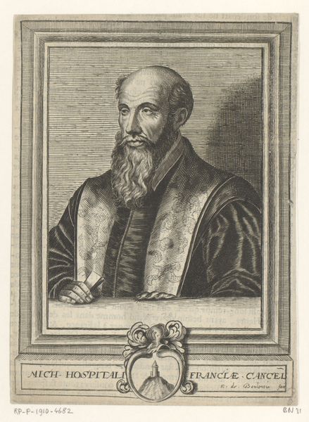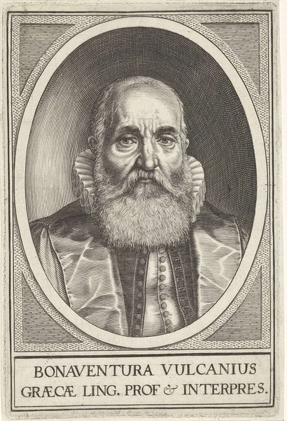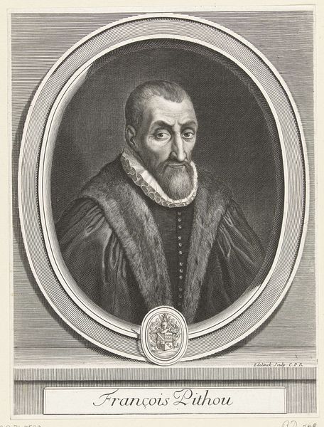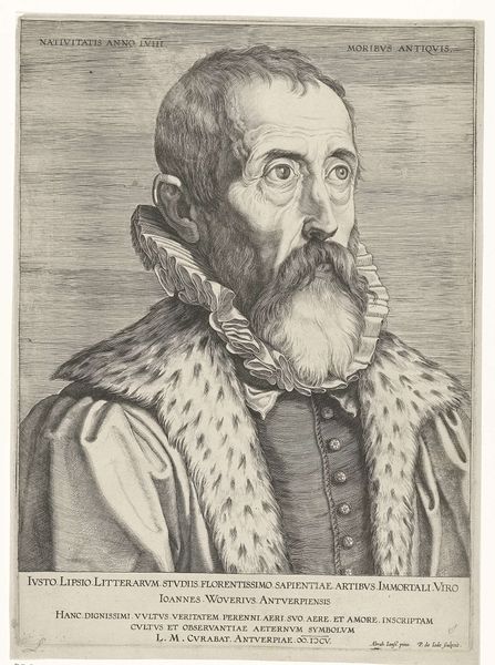 Curator: This engraving from 1682, residing here at the Rijksmuseum, offers a glimpse into the world of Justus Lipsius through the skilled hand of Edme de Boulonois. Editor: The portrait strikes me as surprisingly intimate for its time. The detail captures an inner thoughtfulness; you can almost feel the weight of scholarship. Curator: It's intriguing how the artist uses line and shadow to define not just form, but also character. The meticulous rendering of his fur-trimmed robe, contrasted with the etched backdrop, speaks to the sitter’s status. Editor: Absolutely. But beyond status, this portrait highlights intellectual life amidst burgeoning European anxieties surrounding the consolidation of power and religious reform. Lipsius’ furrowed brow hints at his struggles. We're witnessing a negotiation of identity. Curator: His attire suggests wealth, yet Boulonois deliberately contrasts it with the simplicity of his scholarly accoutrements. It speaks of a humanism, placing mind and knowledge at the center, visualized in compositional space as a key point of intersection. The gaze also invites direct engagement with the viewer. Editor: Indeed, his book anchors the lower portion and forms the physical grounding of this man’s place in society. His upturned hand could signal teaching, sharing the insights that are now immortalized, almost a calling to rise and be part of historical processes. I find myself curious as to the level of social mobility he might have afforded, or was trying to signal with his intellectual activity, or trying to escape... Curator: A powerful interplay indeed. Ultimately, Boulonois delivers not just a portrait, but a structured articulation of Baroque visual vocabulary. Editor: And for me, a starting point for engaging with the complex cultural currents running through 17th-century Europe and its impact on scholarship to this day.