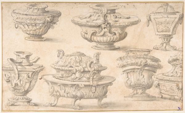 Editor: Here we have Giacomo Rossi’s "Three Ornamental Vessel Designs" from the 17th century, a drawing done in ink on paper. I’m struck by the imposing nature of these vessels and how the fierce animalistic features could communicate the wealth of their patron. How can we interpret the symbolism present? Curator: It is interesting to note the repeated motif of lions and other imposing creatures. In what ways could such symbolism communicate status or project power in the social context of the 17th century, specifically for those commissioning and displaying such elaborate objects? Consider who might be interested in asserting such authority? Editor: Someone seeking to align themselves with nobility or projecting a certain idea of strength. What kind of settings would these designs have been displayed? Curator: Given the era, they would most likely decorate the homes of aristocratic families or affluent merchants and act as visual signifiers. In what way might Rossi's drawing serve the aspirations or tastes of such circles? Editor: By offering designs that signal both classical knowledge and wealth. I see now how Rossi is shaping the visual language of power for a specific social stratum. It goes beyond decoration, doesn't it? Curator: Precisely. The lion heads aren't just decoration, they're a visual code, aren’t they? We can start to analyze how the consumption of art and design intertwined with the social hierarchies and the visual expression of power during this time. It also brings up how design, back then, had to comply to rigid structures. Editor: It's like understanding their place within a larger historical puzzle! Thanks, I will certainly investigate the use of lions in decorative arts more!