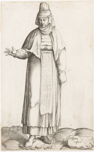 Curator: Wenceslaus Hollar's "Mulier Austriae Superioris," created in 1643, strikes me as a quiet moment captured. Editor: It is, almost austere in its rendering. The etching's focus on texture and form speaks volumes about the material world Hollar inhabited and sought to depict. The engraving showcases a woman from Upper Austria, doesn't it? And right away, the fur stole reads as a stark marker of wealth and status in a pre-industrial, almost certainly deeply class-bound world. Curator: Absolutely. I wonder if he saw her—perhaps not exactly, you know, *this* woman but the idea of her—as representing a kind of steadfastness or strength rooted in the Austrian soil? The folds of her dress evoke, perhaps unconsciously, the contours of a landscape. It's imaginative; baroque in its execution, yes, but more in the careful rendering than in ostentatious flourish. Editor: Baroque certainly, with that lavish collar and the sumptuous fur, though it does look almost weightless on her frame. Thinking about the process... the act of engraving that level of detail with burins and metal plates... it demands intense labor. The cost of the materials as well is significant. How does this translate into understanding the lives of ordinary women in Austria at the time, or who could commission a portrait of this kind? It asks us to unpack the layers of representation and labor inherent in such an image. Curator: The precision, I imagine, also offered the chance to idealize, perhaps subtly? It's not about absolute realism. Her expression is somewhat… veiled. And perhaps that veil is a collaboration between artist and subject; a dance around how much one wishes to reveal or conceal. This adds to the subtle, interior, contemplative nature. It resonates like a hymn played softly. Editor: That veil is carefully constructed through lines and shading, mirroring the layers of social expectation surrounding women. Was this meant to be a single portrait, or perhaps part of a series on regional fashion? The reproductive nature of prints allows for broader distribution. Did it impact local textile production, or encourage cultural exchange? I wonder about her actual experience; how would the subject in the portrait regard its circulation as image/commodity within the burgeoning networks of 17th century print culture. Curator: Indeed. Editor: Right. A print like this offers endless questions that entwine craft, gender, and socioeconomic hierarchies.
