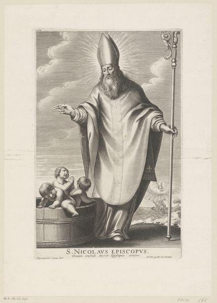 Curator: Here we have Cornelis Visscher's engraving of "Saint Frederick of Utrecht, from Saints of the North and South Netherlands," created around 1650. It's part of the Art Institute of Chicago's collection. Editor: Immediately, the precision and detail catch my eye. You can practically feel the weight of his garments, rendered through incredibly delicate lines etched into the paper. Curator: Absolutely. Visscher was known for his skill with the burin. What strikes me is the calculated role that prints such as this would play. They helped to solidify and spread particular ideas, not just of religious figures, but about the cultural identity of the Netherlands. Editor: A cultural technology, if you will. It raises the question: What does mass production mean for depictions of saints, especially considering their historical association with costly, unique, devotional objects? This wasn't painting but a method that brought Saint Frederick to more accessible settings. The materials say so much. Curator: Exactly. The proliferation of these images shaped popular perception, and also potentially dictated artistic choices in other media as artists sought to replicate what prints had popularized. Frederick's representation is far from neutral; he’s very intentionally positioned within a very specific, Netherlands context. Editor: Looking closely, the patterns on his cloak are fascinating. You can almost trace the maker's movements. It underscores labor, design, and the socio-economic web linked to production and, subsequently, devotion. It takes time, effort, and skill to replicate complex patterns like this using engraving tools, and the choices made for this Saint's attire make clear decisions on material wealth as tied to Godliness. Curator: A tension the Dutch grappled with during the Golden Age, as they navigated wealth and Calvinist principles. Visscher uses the print medium itself to actively participate in these societal dialogues, offering a visual shorthand for the period’s concerns and self-perception. Editor: And perhaps to make it commercially appealing. Even divine images participate in consumer economies. I think this changes my perception about 17th-century prints of the Saints: while obviously not idols themselves, the availability and details surely influenced personal religious views, especially considering their place and circulation through a more Protestant country. Curator: Precisely! Prints held complex social and ideological weight. They influenced lives then, and help us understand their world now. Editor: Thinking about this in terms of production gives us great insight to the life and commerce that was then!