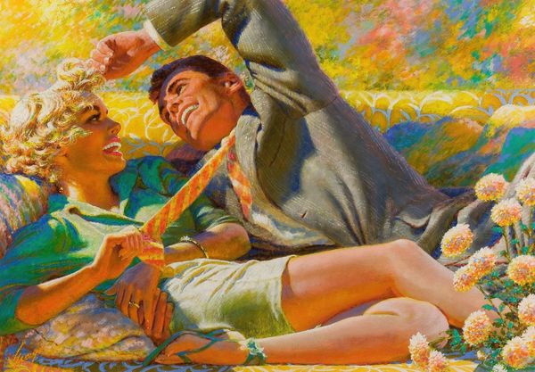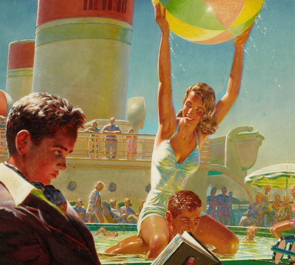 Edwin Georgi made this colour illustration, titled Sunbathers, sometime in the mid-twentieth century, very likely as commercial art. But it's also a document of social history. Georgi's image creates meaning through visual codes of leisure. We see a scene of privileged relaxation: sunbathing, card-playing, and an exoticised masculinity represented by the man draped in a garland of flowers. Georgi was working in a period when the advertising industry was rapidly developing sophisticated methods of representing social class and aspiration. Consider the figures in the painting: they have an idealised appearance and a detached coolness. What do they tell us about the image of wealth and beauty that was emerging in the post-war United States? The whiteness of the figures, especially in contrast to the flowered man, also speaks to the ways that advertising imagery has historically been involved in the social construction of race. To understand its social context, one could research how images of leisure and beauty were used in advertising campaigns of the period.