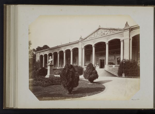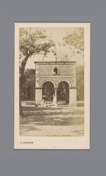 Editor: This is an albumen print entitled "Bloementempel in de tuin van Villa Durazzo-Pallavicini, Genua," likely created between 1855 and 1885 by C. Hodcend. I'm immediately struck by how this romanticized architectural structure becomes almost theatrical within its garden setting. What can you tell me about the history surrounding images like these? Curator: This albumen print provides a glimpse into 19th-century constructions of the 'ideal' landscape. Photographs like this one allowed viewers to participate in a sort of armchair tourism, and shaped the cultural appreciation for spaces like Villa Durazzo-Pallavicini. What do you notice about the figure sitting at the entrance of the "Bloementempel"? Editor: Well, they seem very casually placed in front of something that seems very calculated and ornate... almost staged in a way. It also begs the question of who this person may have been? Someone important enough to pose there? Curator: Precisely! The inclusion of figures and even built-in sculptures are devices that underscore the garden's constructed, rather than 'natural,' state. As you point out, we might ask how the status and relationship of such models affect the picture’s authority or appeal to the viewer. Was photography here participating in an economy of images and influence tied to the leisure class? Editor: I hadn't thought of it in that light before. I was really focusing on the architectural detail. It's interesting how a seemingly straightforward landscape photograph can open up so many avenues for discussion regarding social class and art production. Curator: Exactly! Photography democratized image-making, yes, but photographs were still made within particular historical, technological, and economic frameworks. Editor: This makes me see the photo in a completely different way now, thinking less about the flowers and more about the social dynamics at play. Curator: Likewise! Paying closer attention to audience and agency offers us richer understanding.