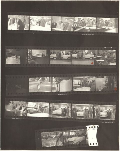 Editor: This is "From the bus 50" by Robert Frank, a gelatin-silver print from 1958. What strikes me immediately is the almost filmic presentation of the strips of negatives themselves, a stark contrast of tones with the thick dark borders framing fragmented views of city life. What can you tell me about it? Curator: Indeed, it's less about capturing a singular decisive moment and more about presenting photography's inherent materiality. We see the sprockets, the frame numbers, even the artist’s marks, like red circles, directly on the film. Consider how these deliberate choices reject traditional notions of photographic composition. Editor: So, the subject matter itself is almost secondary to the photographic process? Curator: Precisely. Focus on the presentation. The work presents a raw, unedited glimpse into Frank's artistic process. Ask yourself: what's the effect of revealing the means of production? Editor: I guess, by showing the film strips, Frank invites us to analyze the individual frames, not just the final image that might have been chosen. He transforms the editing room into the gallery. Curator: Yes, consider the frame, the border, the surface texture - the inherent qualities of the medium, and the meaning they construct. What is the semantic content, and its visual articulation? Editor: That's a really interesting way to think about it, it really does deconstruct the idea of the perfect photograph. Curator: And in doing so, elevate our understanding of its formal qualities. We see the city anew through Frank’s investigation of the medium itself.
