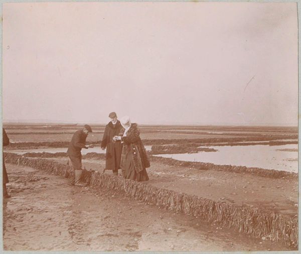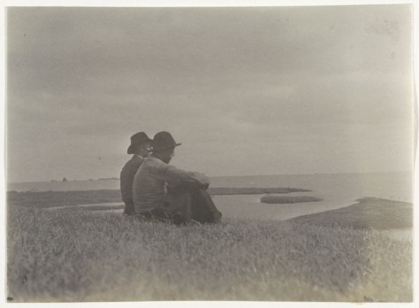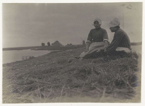 Editor: Here we have "Vrouw aan een water," or "Woman by the Water," an early 20th-century photograph by G. Hidderley. I'm struck by the texture in this image – the rough rocks contrasted with the smooth water and the couple's clothing. What do you see as significant in this piece? Curator: For me, the power resides in understanding the materials and processes at play here. This isn't just a snapshot; it's a hand-printed image, likely requiring significant darkroom manipulation. Look at the tonal range and subtle variations. Considering that this piece is classified as “print photography,” what labor and production does this entail, and who were the actors? Editor: So, are you saying the artistry isn’t just in the composition, but also in the physical crafting of the print? Curator: Precisely! The material conditions of producing photographs in this era dictate not only its aesthetic, but the very availability of image production and its social circulation. We might even question the tag "wedding photography" here. Are they? And how do they choose to sit next to the waterline here in terms of leisure? It also provokes thoughts on preservation, conservation, restoration – these things impact the materials. How do these factors influence our understanding of the subjects themselves? Editor: That's a great point; the physicality adds another layer of meaning. Thinking about the choices in creating this specific object as distinct from the captured image of the moment adds a lot. Curator: Absolutely! And by focusing on the labor and materials, we shift our attention from solely the artistic "vision" to the broader economic and social context in which it was made and viewed. Editor: This focus on the labor really gives me a new way to see the work and think about how things are made. Curator: Indeed, and remembering that the way materials come together gives the image social significance!