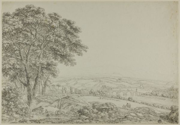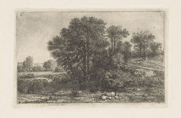Alphonse Legros created this etching titled "Last Rays" using delicate lines and a muted palette. The composition is structured by contrasting textures: dense, tangled strokes in the foreground foliage give way to the smooth, horizontal lines of the distant landscape. The visual weight of the dark foreground anchors the scene, inviting the eye to journey toward the horizon. Legros masterfully uses line to create a sense of depth and space. The short, chaotic lines in the lower portion of the image suggest the wildness of nature, while the more ordered lines in the distance imply a sense of calm and order. This tension between chaos and order reflects the broader artistic concerns of the late 19th century, when artists were grappling with the changing relationship between humanity and nature. Ultimately, the formal qualities of "Last Rays"—its line, texture, and composition—invite us to contemplate not only the beauty of the natural world but also its underlying structure and meaning. The artwork thus becomes a site of ongoing interpretation, reflecting our own evolving understanding of the world around us.