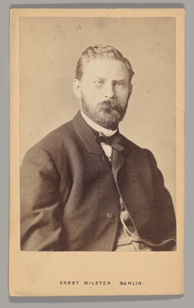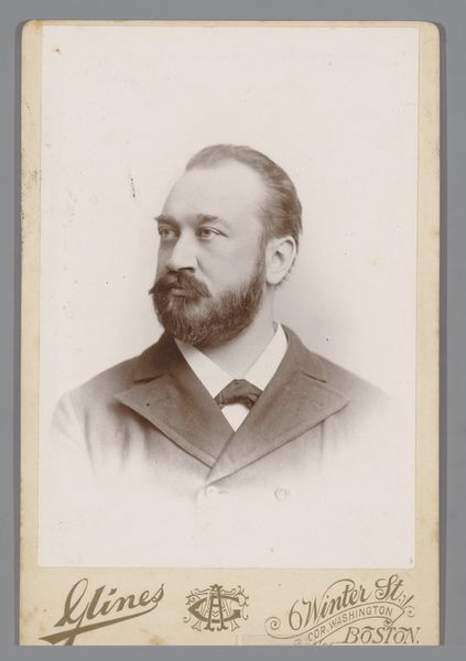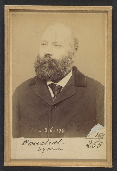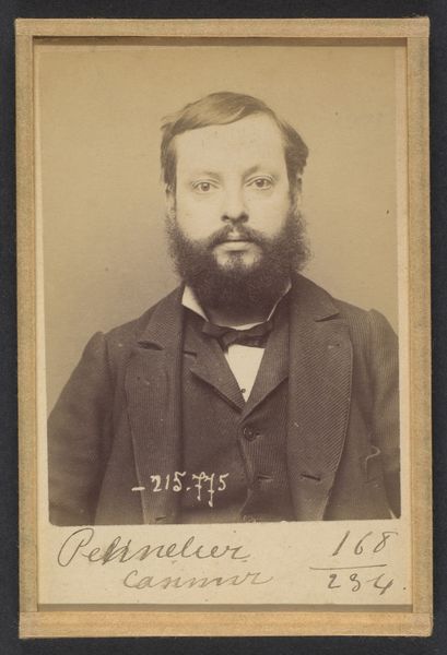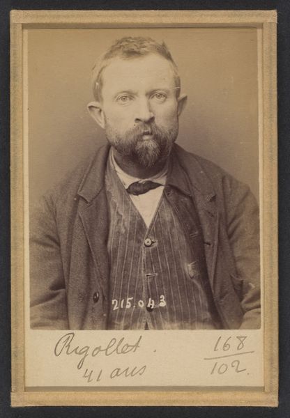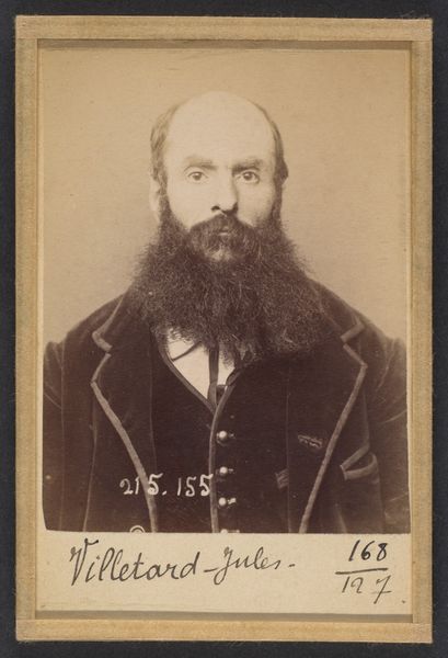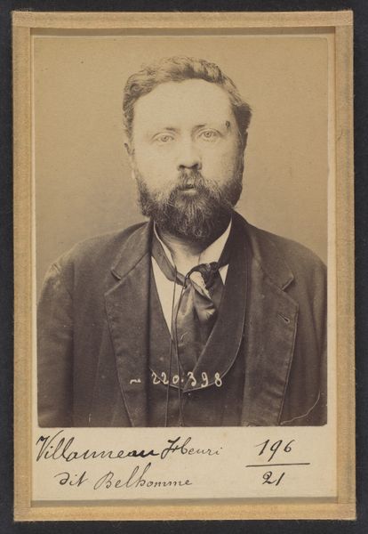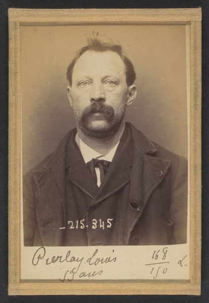 Editor: This albumen print, dated 1894, is titled "Toulet. Guy, Flavien. 41 ans, né à Boufler (Somme). Entrepreneur de peinture. Anarchiste. 23/3/94." and credited to Alphonse Bertillon. It feels like something out of a police file. The subject's gaze is averted, and there's a stark, almost clinical quality to the image. What's your interpretation of this work? Curator: You're right to pick up on the 'police file' feel. Bertillon was the head of criminal identification for the Paris police, and he pioneered using photography for identification, which he termed 'Bertillonage.' This image isn't just a portrait; it's a form of social control. Editor: So, it's not about art, per se, but about documentation? Curator: Precisely. This photograph exposes the complex relationship between art, power, and identity. It uses the visual language of portraiture not to celebrate the individual but to categorize and potentially incriminate them. Look at the inscription – it reads like a rap sheet. Editor: That makes me see the subject differently. I initially thought he seemed simply melancholic, but now… it feels like the image itself is judging him. How were these images used publicly? Curator: They weren't necessarily disseminated widely to the public, but circulated within the police force and government agencies. The very act of cataloging individuals based on perceived threats, particularly 'anarchists,' reveals anxieties of the French Third Republic and its attempt to manage dissent. Think about the implications for freedom of expression and association. Editor: It's fascinating, and a little chilling, how a photograph can become a tool of the state. I’ll definitely look into Bertillonage further. Curator: Indeed, it offers a potent case study on how institutions shape and employ visual culture for social and political purposes.