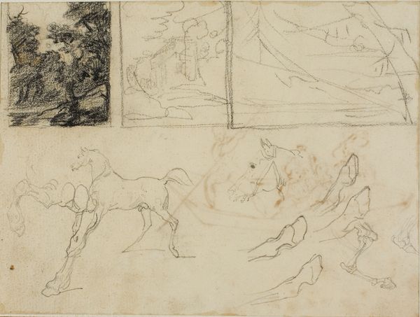 Théodore Géricault rendered these Sketches of a Cavalry Battle and landscape in pencil. Observe the dynamic tension in these sketches, the heroic imagery of the horseman, a motif laden with historical and cultural weight. The mounted warrior echoes the classical equestrian statues of antiquity, symbols of power, victory, and the glory of the empire. Yet, Géricault's composition introduces a psychological undercurrent: the chaos of battle, the fallen soldier, perhaps hinting at the fragility of human ambition. Consider the image of the horse; in ancient times it appeared as a symbol of untamed forces, of instinct and vitality. This primal energy surfaces again and again, from the mythical centaurs to the steeds of war, always carrying the weight of our deepest drives and aspirations. Here, the horse is intertwined with human fate, reflecting our eternal struggle between reason and impulse.