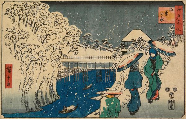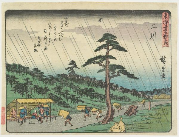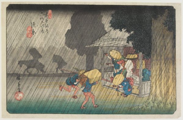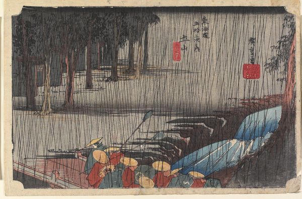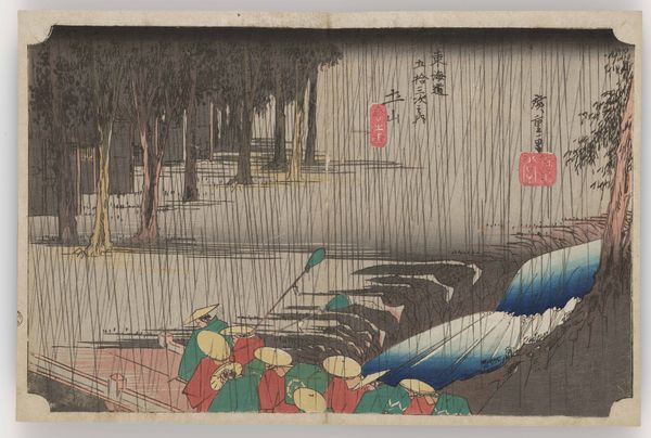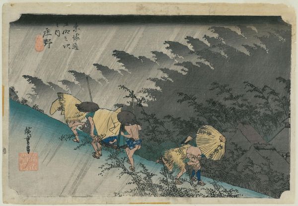 Curator: What a somber, evocative scene. The artist masterfully uses line and color to capture the heavy rainfall. Editor: Yes, it's all encompassing, almost suffocating. I wonder about the economic implications of the weather depicted. Is the journey these travelers are undertaking essential, regardless of the downpour? Curator: Precisely. This woodblock print, titled "Tsuchiyama," by Utagawa Hiroshige, dates back to around 1832-1833 and is currently held at the Minneapolis Institute of Art. Hiroshige, as you know, was a master of the Ukiyo-e style, particularly landscape prints. Here we are looking at ink and color on paper. Editor: Looking closer at these huddled figures, you immediately sense the labor involved in the production of prints like this. Who were the artisans? How were they compensated for carving these woodblocks? Curator: Indeed. The success of prints like this involved complex collaborations, often unrecognized in art-historical circles. However, I find that the composition relies upon contrasting diagonal lines. Observe how the angle of the bridge in the lower foreground meets the incessant rain sweeping from the sky at its peak to draw the eye deeper into the work. Editor: A very astute observation; it's all angles. The umbrellas themselves create such geometric patterns; an exercise in artful visual engineering of negative space! Still, what about the paper itself? Sourced locally, most likely, its relative cheapness speaks to the accessibility of such works to the wider public. These images were designed for mass circulation. Curator: Correct, the use of woodblock printing techniques allowed for mass production and distribution, placing artworks like this into homes and businesses that likely wouldn't own one-of-a-kind originals. Furthermore, in relation to what we see depicted, one could say it reveals the social infrastructure that developed along Japan's roadways. We may think little of bridges, but they greatly enabled and mediated trade, resource distribution, and general communication during this era. Editor: Indeed. Looking at this artwork, the context is as important as the construction. It makes one consider labor and consumption together to better appreciate its inherent value and lasting impact on us today. Curator: And for me, it reinforces the impact and harmony that color and carefully considered form contribute to generating feelings of introspection and the sense of perspective of life's daily journeys.