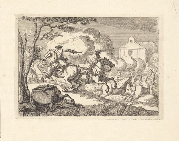 Editor: Here we have "Death of the Firstborn in Egypt," an engraving from 1743, currently housed in the Rijksmuseum. The artist is anonymous. It's striking how much is happening; it feels almost chaotic with such a high level of detail. What do you see in this piece? Curator: This image pulsates with echoes of cultural trauma. The fallen figures obviously allude to loss, and it resonates through time and cultures, yet note the avenging angel poised above. It doesn't present just individual tragedies, but a sweeping act of divine wrath, etched deeply within the collective consciousness. Editor: So, it’s less about personal grief and more about... collective memory? Curator: Precisely. Consider the classical elements like the broken columns and the poses of lamentation: they tie this specific event in Egyptian history to a broader understanding of justice, retribution, and divine intervention that permeates much Western art and literature. Can you see any other visual elements suggesting specific meaning? Editor: Well, the menorah at the top left seems quite deliberately placed... representing, I assume, the Israelites spared from this plague. Curator: Yes, a potent symbol indeed, standing in contrast to the surrounding chaos and destruction. Notice also the beam of light shining down upon the menorah. These aren’t merely aesthetic choices; they are loaded with theological weight, reinforcing the idea of divine favor and historical narrative. Editor: That definitely puts a new spin on how I view it. It’s like the image is both a snapshot of a single event and a reminder of larger, recurring themes within cultural memory. Curator: Indeed. Visual culture has forever carried significant, complex messages beyond just its surface depictions.