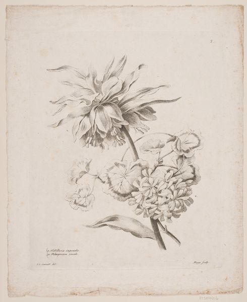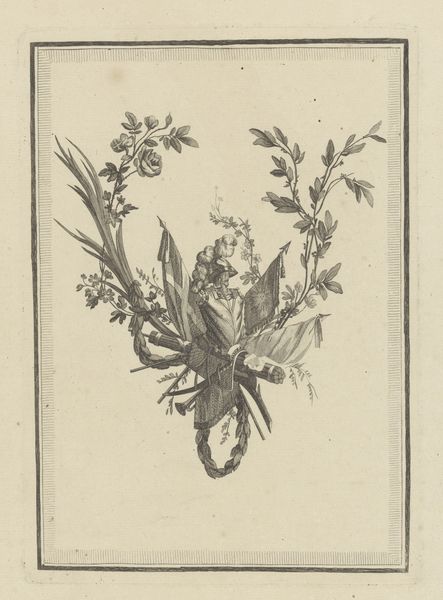 Elias Meyer created "Buket af Aks og Kornblomster," or "Bouquet of Ears and Cornflowers," an etching of delicate lines and intricate detail. The composition is formally structured around a central cluster of grains and cornflowers. Meyer masterfully uses line and texture to differentiate between the various botanical elements. The rough, bristly texture of the wheat stalks contrasts with the smoother lines of the cornflowers, creating a visual and tactile tension. This attention to detail not only showcases Meyer's skill as an etcher but also invites us to consider the natural world through a lens of formal elegance and scientific observation. The bouquet, tied loosely with a ribbon, suggests both fragility and abundance. This interplay challenges any fixed understanding of nature as purely ornamental or purely functional, presenting it instead as a complex system of interdependent forms.