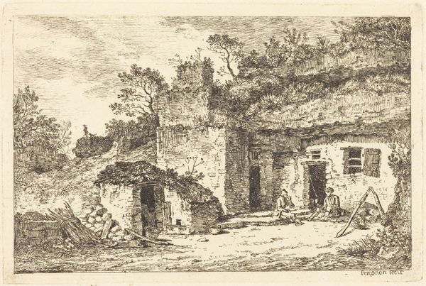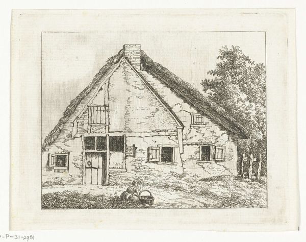Jabes Heenck created this etching, 'Farmhouse with a Well,' around 1780. The composition is dominated by a rustic farmhouse, its thatched roof heavy and textured, drawing the eye upward. The stark contrast of light and shadow emphasizes the building's uneven surfaces, lending it a tactile quality that is quite palpable. Heenck's use of line, particularly in the rendering of the farmhouse and the well, creates a sense of depth and volume within the small format. Observe how the etched lines define not just the form, but also the texture of the aging structure. The building is presented in all its irregular angles, with a seemingly unstable structure. The semiotic weight of the composition lies in its depiction of a humble life, where each line and shadow convey the effects of time. The careful construction of this small landscape speaks to a larger interest in the aesthetic qualities of everyday scenes. It is a meditation on the rustic and the rural, transforming ordinary life into a rich visual experience.