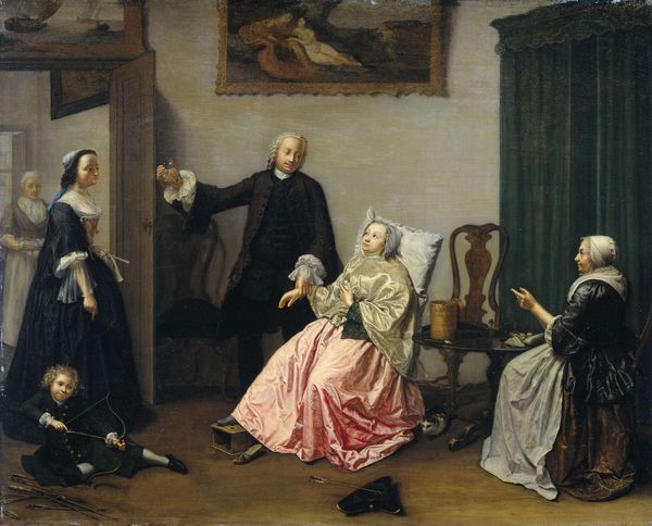 Editor: So, here we have Cornelis Troost's oil painting, "Johanna en de joodse kooplieden," from 1741. It's a rather crowded interior scene, and there's definitely a sense of transaction happening. How do you interpret the socio-political context surrounding a work like this? Curator: The image clearly presents a negotiation, but it's framed within a very particular power dynamic reflective of 18th-century Dutch society. Look at Johanna's central position and opulent clothing compared to the more shadowed, almost caricatured portrayal of the Jewish merchants. It highlights the established hierarchy and potentially the prevalent attitudes toward Jewish people in commerce at the time. Does it strike you as a neutral depiction? Editor: Definitely not neutral! I see the contrast now – the exaggerated features of the merchants feel… loaded. Were such portrayals common? Curator: Sadly, yes. Genre paintings like these, while seemingly innocent depictions of everyday life, often reinforced existing prejudices and stereotypes. They served to solidify a certain understanding, or rather misunderstanding, of marginalized groups within the broader culture. The painting is therefore not just art, but historical document reflecting socio-political attitudes. Editor: That’s disheartening, but important to acknowledge. It really changes how I see the painting – it’s not just a transaction, but a statement. Curator: Precisely. It reminds us that art is never truly apolitical. It’s entangled with power, representation, and the dominant narratives of its time. And understanding this helps us to deconstruct the underlying ideologies at play. Editor: I’ll never look at a genre painting the same way again! It's a stark reminder to consider whose perspective is being prioritized. Curator: Indeed. Analyzing the "why" behind the image, in relation to the historical and cultural contexts, makes the experience of seeing that painting truly transform.