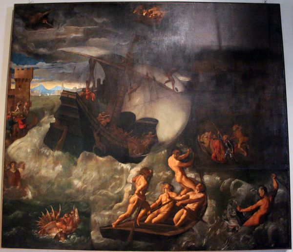 Editor: This is "Winter (The Flood)" by Nicolas Poussin, painted in 1664. It feels…apocalyptic. All this chaos and desperation in the face of a storm. What do you see in this piece, considering its historical context? Curator: Beyond the literal depiction of a flood, I see a powerful commentary on societal breakdown and the precarity of human existence. Think about 17th-century Europe: plague, religious wars, famine. Poussin's painting doesn't just show us a disaster; it shows us how power structures crumble and how deeply inequality affects who survives. Notice who is helping who, who is left to fend for themselves. How does that strike you? Editor: That makes the people trying to save each other feel more significant, like a small act of resistance against the overwhelming chaos. Is the image perhaps alluding to class warfare? Curator: Precisely. Consider those clinging to the rocks versus those swept away. It's not simply about bad luck; it’s about who had access to safety, to higher ground, both literally and figuratively. How do you see the role of the landscape itself contributing to this narrative? Editor: The landscape feels almost indifferent, majestic in its destruction. The storm doesn't care about the individuals struggling below; it just…is. So nature itself reflects and reinforces this indifference of society. Curator: Exactly! And Poussin, by depicting it this way, compels us to question those power dynamics, doesn't he? Art becomes a call for awareness. Editor: I never thought about classical painting having such contemporary relevance. Curator: Art history, when approached with a critical eye, constantly reveals those uncomfortable truths about our shared humanity. We are left asking: Who gets saved and why? Editor: That’s a powerful way to look at it. I’ll definitely see Poussin differently now.