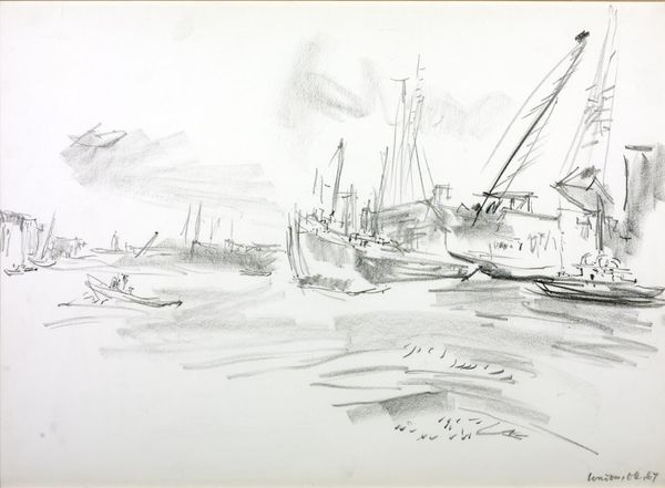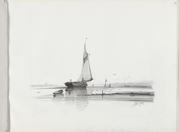 Albertus van Beest made this drawing of sailboats on water using graphite on paper. The appeal of this work lies in the artist's technique: he deftly exploits the inherent qualities of graphite to give texture, weight, color and form to the subject matter. Note how the varying pressure and soft, smudged lines create the illusion of movement, capturing the dynamic interplay between the vessels and the restless water. Van Beest engages with a rich tradition of maritime art while also alluding to the wider social context of 19th-century seafaring, reflecting the era’s reliance on trade, transport, and naval power. The image subtly references the labor involved in sailing, the lives of seafarers, and the socio-economic implications of maritime activities, with the presence of laborers implicit to the image. Considering the materials, making process, and historical context allows us to fully appreciate the artistic skill and cultural significance of this seemingly simple drawing.