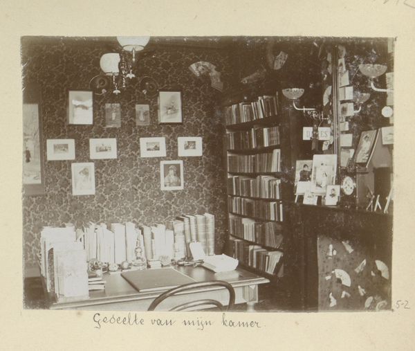 Editor: This is an 1889 photograph by Henry Pauw van Wieldrecht, "Kamer met boekenkasten en wandornamenten," which translates to "Room with Bookcases and Wall Ornaments." It’s a fascinating snapshot of a very cluttered, lived-in space. What stands out to you the most? Curator: For me, this photograph is deeply compelling as a portrait, though not of a person. Consider the intense domesticity of the scene, how the wallpaper presses in, the layers of personal effects displayed on the walls, the books crammed onto shelves, objects scattered on the floor. How does this room speak to societal values about privacy, wealth, and intellectualism at the close of the 19th century? Editor: That’s a great point; I hadn’t thought about it as a portrait of values. I just saw it as a somewhat chaotic interior. Are you saying that the arrangement, or perhaps disarray, is intentional, reflecting something specific about the subject? Curator: "Intentional" may be too strong a word. I would say, though, that these items were likely selected and arranged with specific intentions that reflect a specific worldview of gender roles and class status. What is more intriguing to me, however, is that they have become a window through which we view that worldview. Think about what it means for someone to display objects versus simply owning them. What statements are being made about the resident's beliefs and position? Does this resonate with discussions about social identities through interiors today? Editor: So it’s less about what’s physically in the room, and more about the statement being made by having those specific objects on display. It’s a constructed identity through possessions. Thank you, it certainly shifts my thinking on domestic spaces. Curator: Exactly. What a potent reminder that the environments we construct are powerful visual narratives. Every space holds echoes of past social structures, even if unconsciously preserved!