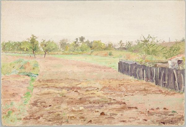 Curator: Dodge Macknight's "Old Breton Stables, Belle Ile" presents a scene where architecture meets landscape in a subtle dance of light and form. Editor: Immediately, I notice the pervasive mauve hue. It feels like the whole scene is bathed in the fading light of day, with textures created by visible brushstrokes. Curator: Indeed. Macknight uses color not merely to represent, but to construct the spatial relationships within the painting. Observe the subtle shifts that delineate the stables from the fields beyond. Editor: And the materiality of those fields—what seems like a worker tending to the stacks, the distant windmill suggesting a whole cycle of labor and production in this Breton landscape. Curator: The artist plays with depth by softening the background elements, drawing our eye back to the solid geometry of the stables themselves. It’s a study in planes and recession. Editor: Seeing the human element gives it such a layered context; it is more than just buildings, but about labor and the way that people are engaging with that land. Curator: Ultimately, Macknight offers a structured yet evocative glimpse into rural life. Editor: It definitely has me wondering about the daily lives embedded within this place.