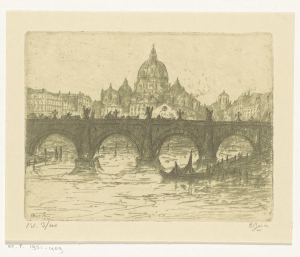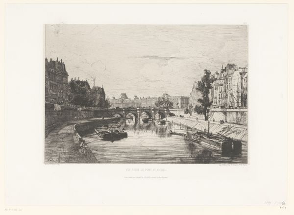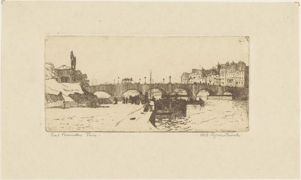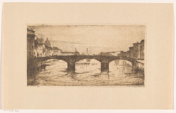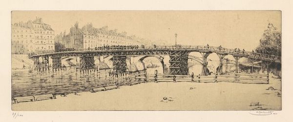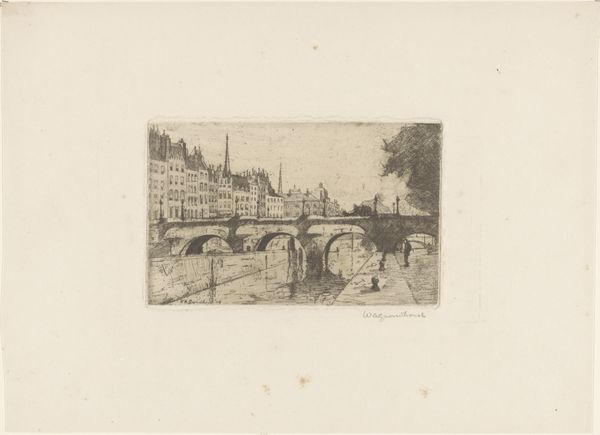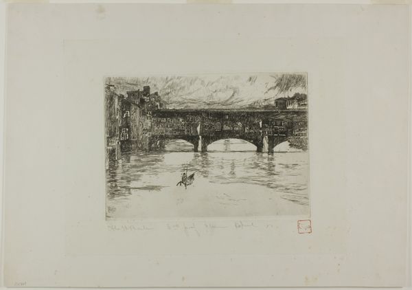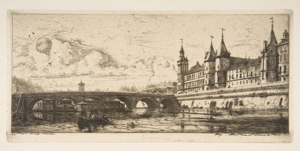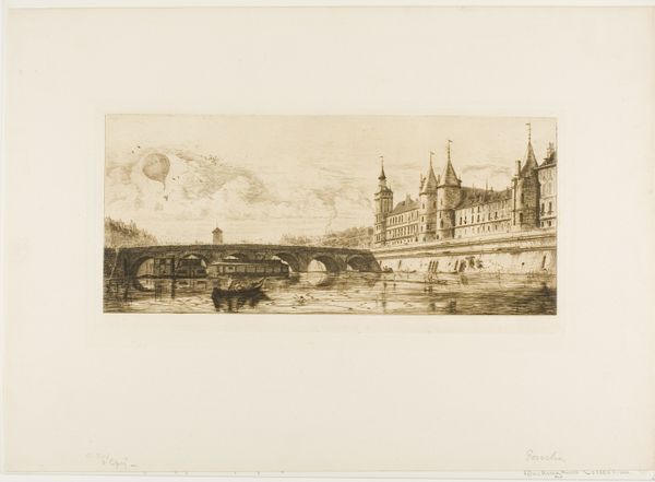 Editor: This is "Lucerne," a 19th-century etching by George Taylor Plowman, currently housed at the Minneapolis Institute of Art. It depicts a covered bridge, likely in Switzerland. What jumps out at me is how detailed the stonework and the wooden structure are. What can you tell me about it? Curator: It’s intriguing to consider this print as a record of material production and labor. Think about the physical bridge itself. Who built it? What were the conditions of that labor? Plowman's print flattens the complex history of resource extraction, construction, and ultimately, consumption by tourists into a neatly packaged image. Editor: So, the choice of etching as a medium—a relatively accessible form of printmaking—further underscores the commodification of this place, Lucerne? Curator: Precisely. Etchings, unlike unique paintings, can be reproduced, circulated, and consumed. Plowman is participating in the tourist economy, using his skill to create an object easily bought and sold, reproducing this image. Think about who buys it. Who consumes the image of Lucerne versus experiencing the actual place? Editor: That makes me consider the kind of paper used, too. Its texture, its cost… How might the quality of the materials speak to Plowman's target audience or the perceived value of the artwork? Curator: Exactly! Every element – from the ink, the paper, to the method of reproduction, feeds into our understanding of the work's position within a network of economic and social forces. It asks us to consider what we value and how art is imbricated in the production and distribution of value. Editor: It’s fascinating to see this seemingly simple landscape as a layered commentary on production and consumption. It gives me a completely new perspective. Curator: Indeed, viewing art through a materialist lens prompts us to ask difficult questions and to acknowledge the economic and labor-related context of making and looking at art.