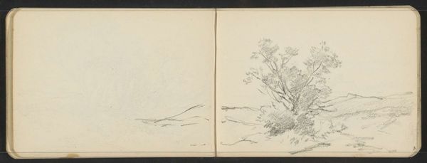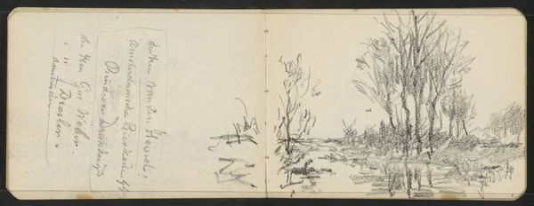 Curator: Willem Cornelis Rip created this work, "Landschap met bomen," sometime between 1914 and 1916. It appears to be a pen and pencil drawing. Editor: Ah, a quick study! It’s that in-between time in the late afternoon when the sun dips low, stretching shadows long and thin. You can almost feel the quiet stillness settling over the land. Curator: I'm interested in how Rip uses this landscape to perhaps explore ideas around place and memory. Considering the time period, during the first World War, what impact might such conflict and violence have on our understanding of our relationship with the land, and perhaps even ideas of safety and identity? Editor: That's fascinating! And for me, personally, it makes me think of how landscapes hold layers of stories. Each line and mark he makes carries with it a kind of personal experience of witnessing something that becomes universal. It invites a sense of empathy. Curator: I agree, and this empathetic invitation is reinforced in part by its intimate, almost portable, nature as a sketch found in a notebook. What social position does that intimate point of view assume? How might we, the viewers, imagine this position as something other than white and male, opening the space to experiences or points of view usually marginalized or excluded? Editor: Right. Because with a sketch, you catch a raw, unfiltered essence. You know? Like catching the wind. And I think this openness of media lends itself particularly well to an experience beyond specific subjectivities; one almost becomes lost to observation itself. Curator: Thinking about materiality, I wonder what type of pencil and paper Rip would have used? How do the physical qualities of those materials contribute meaning to our experience of the work? And what considerations must we address regarding material access when thinking about class? Editor: Those rough strokes evoke a sense of urgency, right? Or at least some quickness. I wonder what else he drew that day? What other vistas and visions filled that notebook? Curator: It invites curiosity! The type that drives both artistic expression and historical research! Editor: Absolutely. A little treasure that fits right in your pocket!
