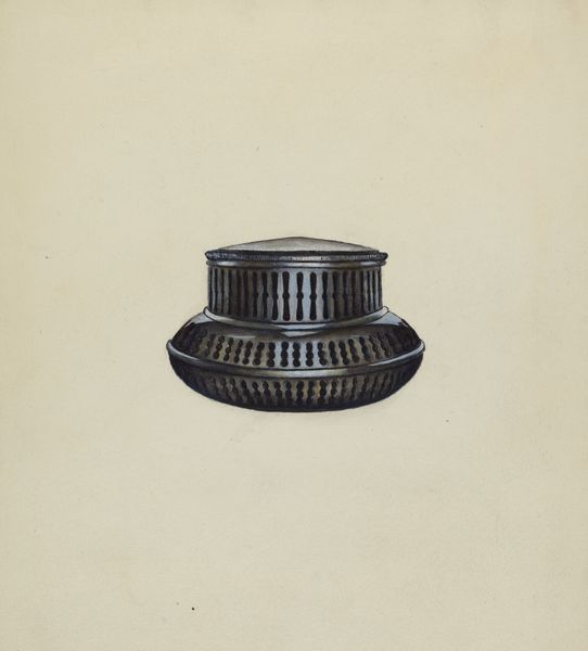Editor: Here we have John Tarantino's "Salt Cellar" from around 1936, rendered in watercolor and drawing. I’m struck by the intense blue and how it gives such presence to something so utilitarian. How do you interpret this work? Curator: I see a quiet subversion. In the context of 1936, a seemingly simple rendering of a salt cellar actually carries weight. Think about the socio-economic landscape – the Great Depression. A focus on everyday objects, even luxury items, speaks to a yearning for normalcy, or perhaps even a critique of the very notion of luxury amidst widespread poverty. The deep blue, while beautiful, can also symbolize sadness or scarcity, depending on your perspective. Does that resonate with you at all? Editor: I hadn't considered the Depression-era angle, but now that you mention it, the blue does feel a bit somber. Was the salt cellar a common symbol at the time? Curator: Not necessarily a common symbol, but the choice to depict such a domestic object is what’s telling. Consider the rise of social realism during this period, an art movement that aimed to depict the struggles and realities of everyday life, particularly for the working class. Tarantino’s “Salt Cellar” isn’t overt propaganda, but it subtly invites us to contemplate class, consumption, and access. What statement do you think Tarantino was trying to make? Editor: Maybe he wanted us to think about the simple things that we take for granted? I think it's interesting to examine art using this viewpoint and realize it tells a bigger story. Curator: Exactly. It’s a quiet, yet potent reminder that even the most mundane objects can hold profound cultural meaning. This artwork opens up conversations that speak volumes!