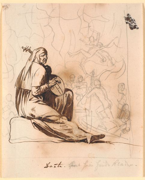 Curator: This drawing is entitled "Den opstandne Kristus," or "The Resurrected Christ," and was created in 1847 by Martinus Rørbye. It is crafted with ink on paper and currently resides at the Statens Museum for Kunst. My first impression is a kind of weightless solemnity. Editor: It has an almost ethereal quality about it, doesn’t it? I’m drawn to how Rørbye has captured a very distinct moment of awe and perhaps a sense of fear with so few lines. Curator: Absolutely. Note how Rørbye employs this minimal linework, particularly the contrasting bold strokes around Christ himself. The darker ink accentuates him, drawing our focus. Consider the two kneeling figures, presented in positions of subservience and worship. It’s a timeless composition really. Editor: Subservience is the operative word. Who were the figures designed to appeal to and include? And, perhaps, more urgently: who might they implicitly exclude or dominate through this visual language? I also note Rørbye was a staunch nationalist, with many North African influences—did that cross-cultural engagement soften any social boundaries, or further entrench already hardened hierarchies? Curator: Well, this portrayal aligns directly with Christian iconography depicting Christ's resurrection and subsequent encounter with his followers. Those are, according to Biblical canon, Mary Magdalene and another woman at the tomb. Editor: Precisely. So what established notions about authority, faith, gender roles, and devotion are at play here? It feels like the very medium echoes an old-world sense of power. A sketch intended perhaps as groundwork to build a dominant narrative? Curator: Perhaps. But, from the symbolical perspective, it speaks to an enduring hope and renewal, deeply embedded in cultural consciousness. The ink—a material traditionally associated with permanence—emphasizes the everlasting nature of faith and the promises of Christian doctrine. Editor: I agree with the symbol of faith being strongly evoked through Rørbye's use of medium. Yet, perhaps in light of current issues about political identity, its initial social implications also bear scrutiny, too. Curator: Food for thought, indeed. Despite these perspectives, I still come back to the power and delicacy found within these simple strokes and shadows that render this key biblical narrative. Editor: Yes, considering these layered perspectives is why I find the artwork relevant still. Hopefully these contextual ideas allow everyone to bring their own insight too.