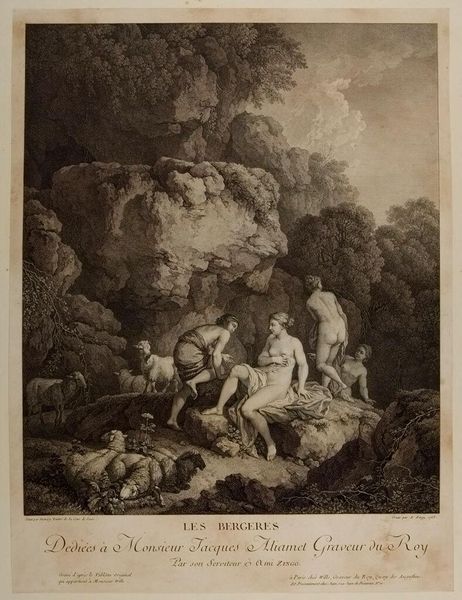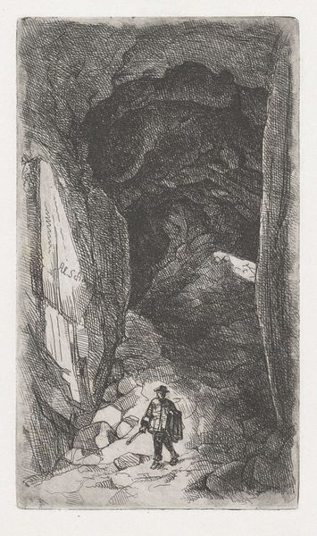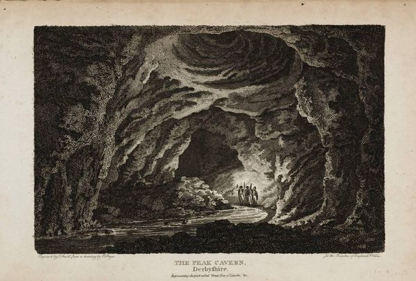 Curator: This is "The Peak Cavern, Derbyshire: Roger Rain’s House," engraved by J. Noble from a drawing by Edward Dayes. The Tate holds this print, though it lacks a specific date. Editor: It's certainly evocative! That inky blackness offset by the tiny figures holding torches. It feels like confronting the sublime—smallness against overwhelming nature. Curator: Absolutely, the cavern itself looms large, a symbol of the earth’s hidden spaces. The figures, dwarfed by the landscape, carry their lights—a beacon of human endeavor in the face of the unknown. Editor: And "Roger Rain's House" is an intriguing name. It conjures up folklore, the idea of nature as a dwelling, a refuge, or perhaps a prison. Curator: It’s a potent reminder that our experience of landscape is always filtered through cultural narratives. This image speaks volumes about the evolving relationship between humans and the natural world, shaped by exploration and romanticism. Editor: Reflecting on this, it makes me consider how our perception of nature is inevitably colored by the stories we tell about it.