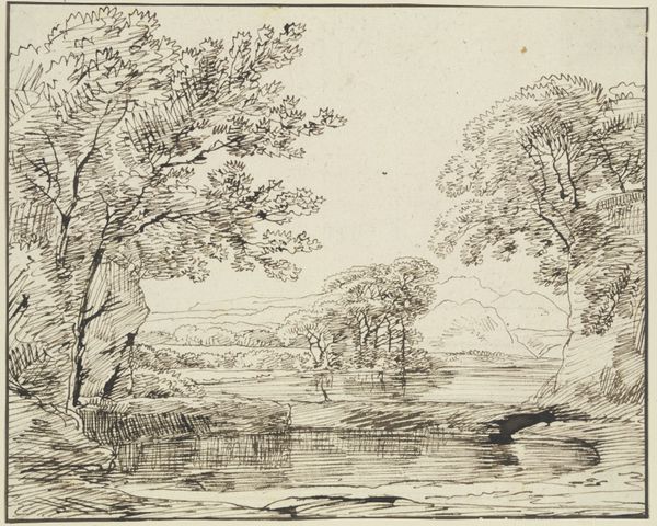 Here in the Städel Museum is a pen and brown ink drawing titled "Gewässer mit baumbestandenem Ufer" by Franz Kobell. At first glance, the composition is dominated by a reflective body of water, framed on both sides by dense vegetation. The drawing’s structure is built upon the interplay of line and space; the trees and foliage rendered with delicate, almost frenetic strokes, contrasting with the calmer, horizontal lines used to depict the water’s surface. This contrast creates a visual tension, a dialogue between the wildness of nature and its tranquil reflection. Kobell’s choice to use brown ink lends a sense of warmth and earthiness, grounding the scene in a naturalistic setting. Yet, there’s a subtle abstraction at play. The lines don’t merely represent form; they seem to evoke the very essence of each element. Consider how the drawing challenges our perception, inviting us to see beyond the surface and consider the deeper structures that shape our understanding of the natural world.