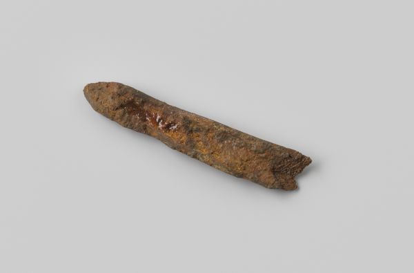 Editor: Here we have a "Fragment dierlijk rib uit het wrak van de Oost-Indiëvaarder Hollandia"—that's "Animal rib fragment from the wreck of the East Indiaman Hollandia." It predates 1748 and is currently held at the Rijksmuseum. Looking at this weathered piece of wood, it’s easy to imagine the secrets it holds. How would you interpret this relic, knowing its history? Curator: The splinter, bleached and worn, serves as a potent emblem. It whispers tales of maritime ambition, of the Dutch East India Company's dominance, and, most strikingly, of fragility. This artifact transports us to a precise moment, before 1748, when the Hollandia met its dramatic end. But think, what resonates more powerfully – the specific animal this rib belonged to, or the symbolic weight it carries from the ship's demise and lost dreams of an entire empire? Editor: I hadn't considered the "empire" angle so directly. The personal details are absent and leave much to the imagination. Are there ways the museum context shifts how the object signifies the past? Curator: Absolutely. Here in the museum the isolation of the artifact grants symbolic prominence. The rib transcends its mundane origin and transforms into a relic, charged with collective memories. Consider how many lives are implicated: sailors, animals aboard, merchants awaiting cargo... each contributing layers to this unassuming object's symbolic tapestry. Editor: So it is less about the wood itself, and more about how it fits into our grand narrative? Curator: Precisely. Its weathered texture, for example, evokes temporality and invites us to contemplate our connection to history. This piece of wood transcends the particulars and invites universal meditations on time, ambition, and the poignant intersection of nature and culture. Editor: I see it so differently now. Thanks for showing me the power this single fragment can contain! Curator: My pleasure. May this encourage a deeper appreciation of history's resonance within the artifacts we see every day.