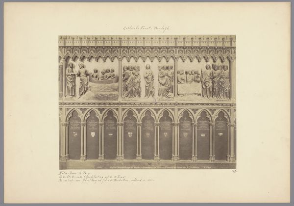 This photograph of the Notre-Dame in Paris was captured by J. Kuhn. Here, the façade is presented through its architectural elements: the rhythmic repetition of pointed arches and vertical piers. Kuhn directs our attention to structure, emphasizing how the cathedral's design employs geometry to divide space and support weight. The sepia tones evoke a sense of antiquity, aligning the photograph with historical preservation efforts that were gaining momentum in the 19th century. The photograph does not only record, but also interprets the cathedral as a study in form and light, an intersection of faith and engineering. Notice how Kuhn's formal approach invites a focus on the cathedral's surface—its texture and pattern. He suggests how the material qualities of stone and glass become aesthetic carriers of meaning, engaging with historical and architectural discourse.