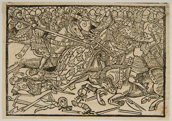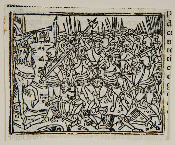 Curator: What strikes me immediately about this anonymous print, "Book III.60. Romans battle the Aequans and Volscians," is the sheer density of the scene. It's a chaotic dance of black lines, isn't it? Editor: Absolutely! It's a visual explosion. Knowing this piece resides within the Harvard Art Museums helps frame its purpose; these images were often used to illustrate historical texts and disseminate knowledge. Curator: Yes, and it's fascinating how the artist captures movement and the brutality of battle with such limited means, just stark contrast. I almost feel like I can hear the clash of swords! Editor: Indeed. Consider how these prints democratized history. Suddenly, tales of Roman conquest were available beyond the elite, shaping public perceptions of power and civilization. Curator: To me, the beauty lies in the artist's ability to convey such a visceral scene. This artwork reminds us about the importance of illustrations in bringing history to life! Editor: I agree, and it underscores the power of imagery in shaping our understanding of the past.