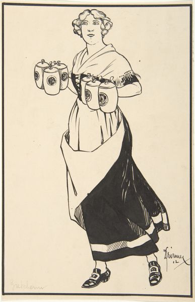 Curator: Here we have William Nicholson's striking portrait of Sarah Bernhardt. What's your take? Editor: Stark, theatrical. The high contrast and flattened forms create an immediate sense of drama. It’s less about likeness and more about presence. Curator: Exactly! Nicholson really captures Bernhardt’s commanding stage persona. I feel like it's an old photograph. Editor: The limited palette is key here. The beige emphasizes the starkness of the black figure, highlighting the planes and structure. Curator: You know, Bernhardt had this incredible ability to transform herself, to become mythic, which this portrait absolutely echoes. It gives her such an intimidating aura! Editor: Indeed. Through simplified form and graphic impact, Nicholson immortalizes the actress as an icon. Curator: Well put. It makes one consider the power of reduction in amplifying a subject's essence. Editor: Absolutely, and it gives me so much to consider about performance and identity.